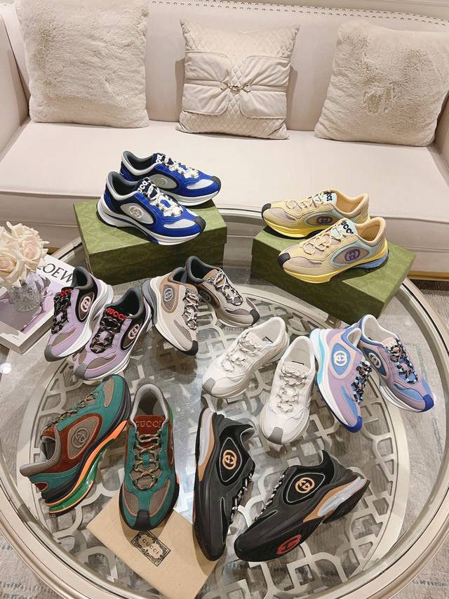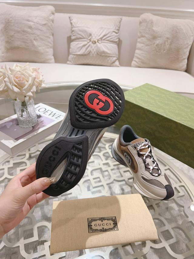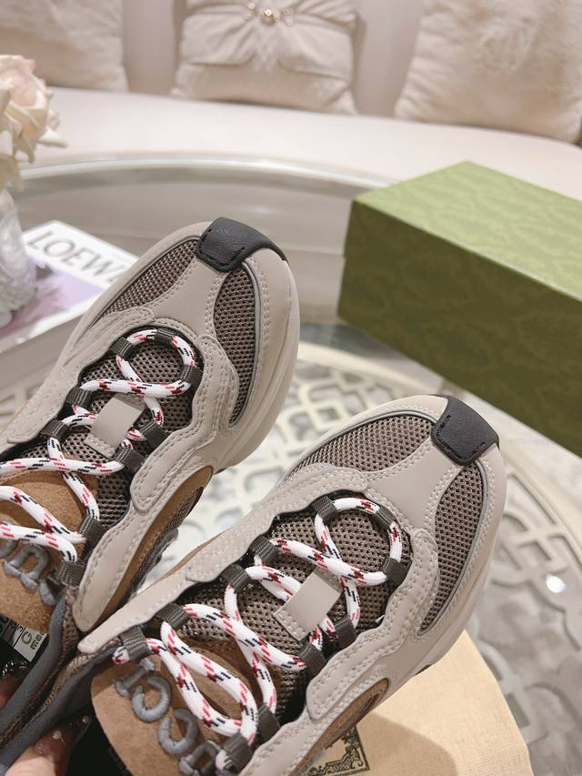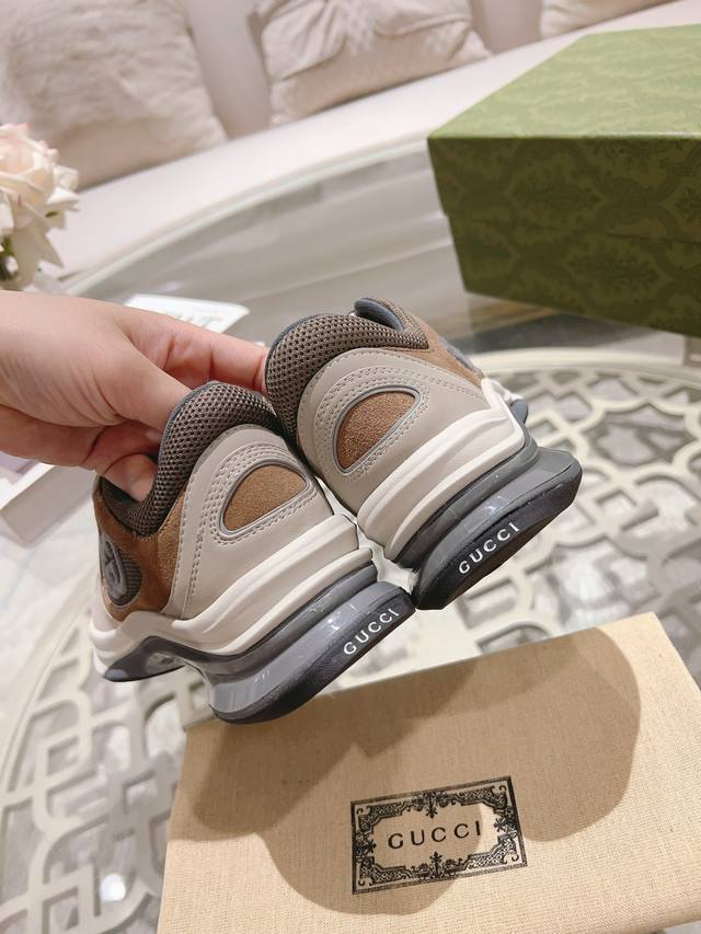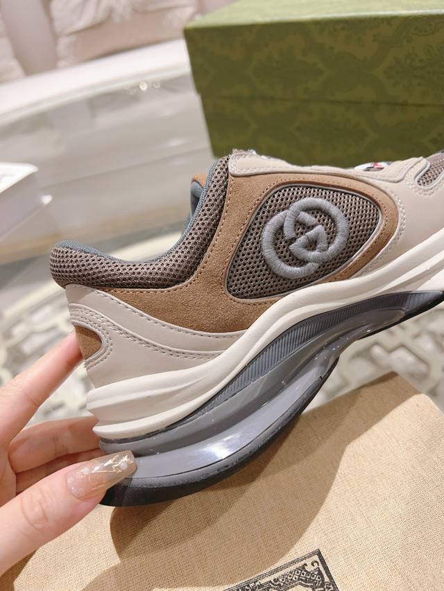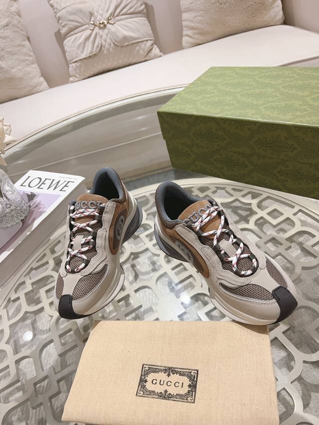 G's latest hit, dad shoes, set the pace for fashion. The new series continues to draw inspiration from the daily lives of other eras while incorporating the essence of contemporary design. Crafted from 3D-printed imported top-grain cowhide leather, it's embellished with the classic interwoven Double G pattern, showcasing the profound brand identity. Fabric: Original imported top-grain nubuck cowhide. Lining: Cowhide lining. Footrest: Original Double G pad. Outsole: Modo. Tongue. Size: Air-pressed original. Packaging: Complete set with a carry bag. Note: All details are compared with the original. P high-top version. Sizes: Women's 35-40, 40-45.