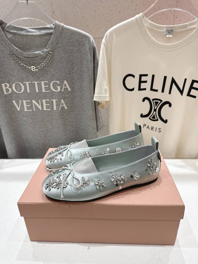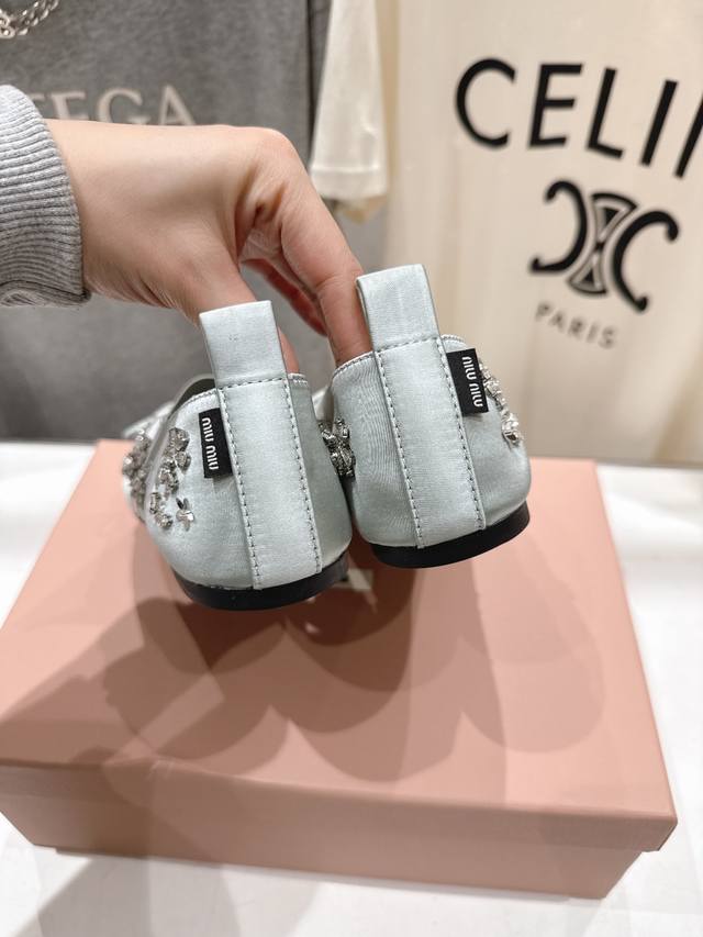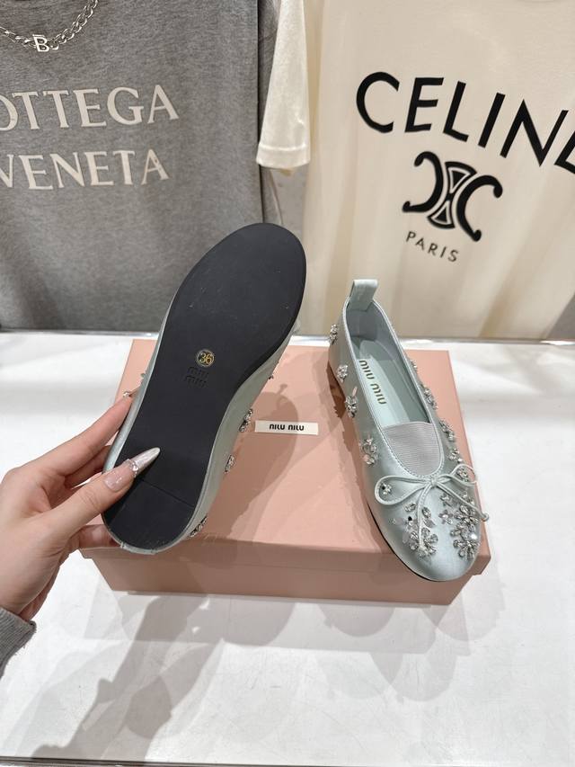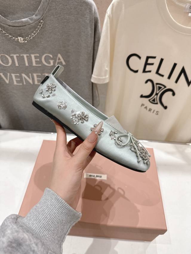 High-quality factory direct. Miumiu F033 2026 Spring/Summer new French fairy-style Mary Jane flat shoes. These ballet flats debuted at the 2026 Spring/Summer fashion show, reinterpreting the iconic style of the Miumiu collection. The chic design, adorned with bows and elastic bands, exudes feminine charm. From glamorous dresses to sleek trousers, these ballet flats are versatile enough to make you the centerpiece of any outfit. Material: Custom original silk fabric + imported rhinestones. Insole: Sheepskin. Outsole: Original rubber outsole. Sizes: 35-39. 40.41 Custom-made, no returns or exchanges.