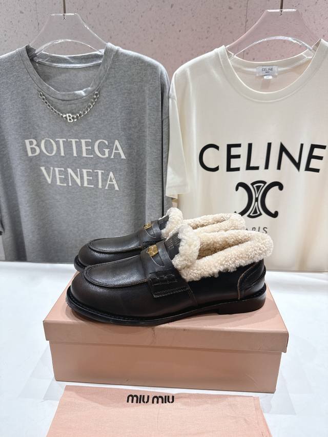 High-quality factory-made Miu Miu F049 2025 Autumn/Winter New Lucky Coin Series Driving Shoes with Fur Added Loafers. Popular with celebrities and fashion bloggers on Xiaohongshu. The upper is decorated with coins and an embossed Miu logo, showcasing a unique and classic style. Very comfortable and warm to wear, versatile and stylish. Custom-developed hardware, custom leather colors. Upper: Custom imported top-grain cowhide. Lining: Imported sheepskin. Sole: Original molded rubber outsole. Sizes: 35-40, 40.41 (customized). Full packaging included.