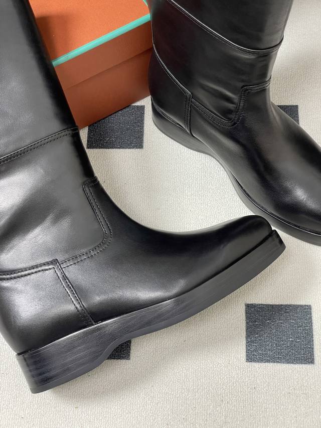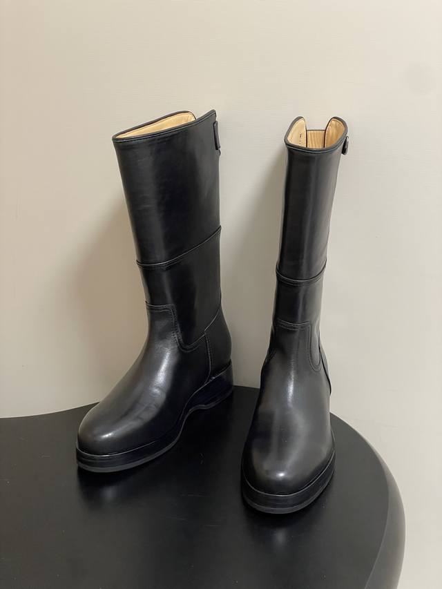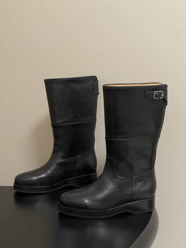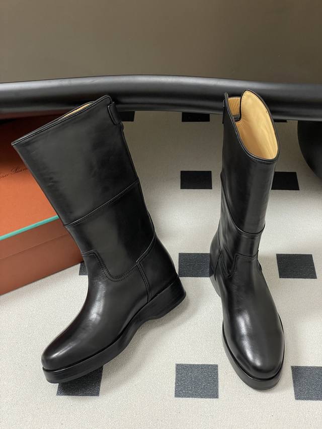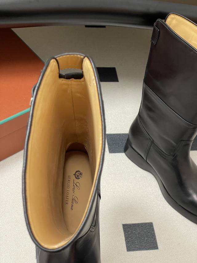 High-quality Loro Piana Lp60S Autumn/Winter Lupo Straight Boots, Slip-on Mid-calf Boots. These Lupo boots are crafted from exquisite leather, treated with natural wax for a lustrous sheen and clear, irregular texture. An adjustable buckle strap at the bottom of the boot shaft evokes an elegant belt, while the rounded toe and stitching details showcase exquisite craftsmanship. A timeless silhouette design. Upper: Calfskin; Lining/Insole: Cowhide; Sole: Original molded rubber outsole; Sizes: 35-39; 40.41 (Made to order, no returns or exchanges).