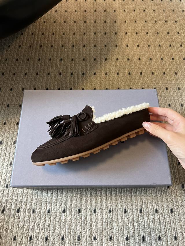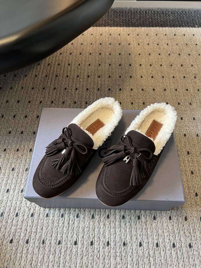 . Made of suede, these shoes feature a delicate upper and a fleece interior for warmth in winter, perfect for cold weather. Decorated with tassels and a bow, the tassels add a touch of retro and playful flair, while the bows enhance the shoe's delicate and adorable look, creating a retro yet playful style. These mules are designed without a heel, making them easy to slip on and off while also imparting a casual, relaxed feel. Paired with high-waisted jeans and a loose sweater, they're both comfortable and stylish. The tassels add a finishing touch, perfect for everyday outings or weekend getaways.