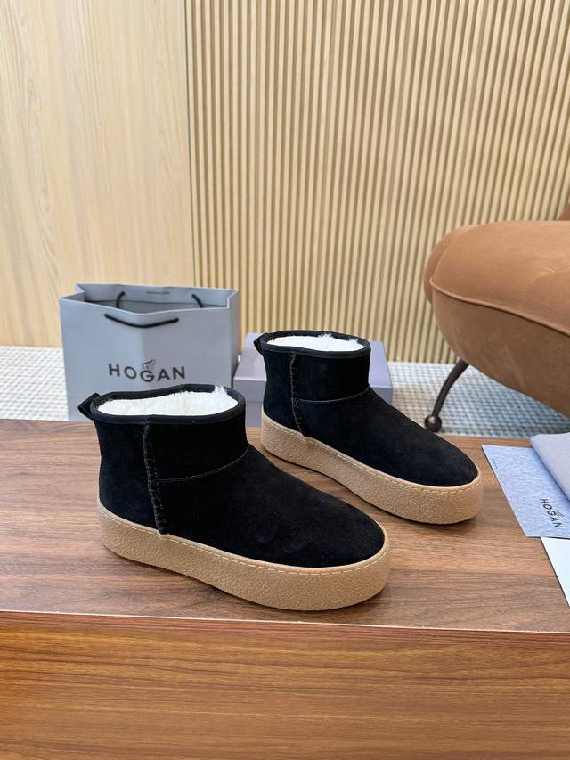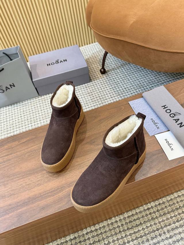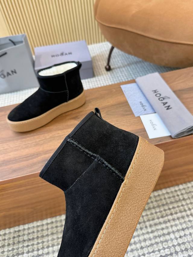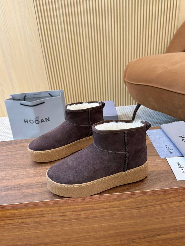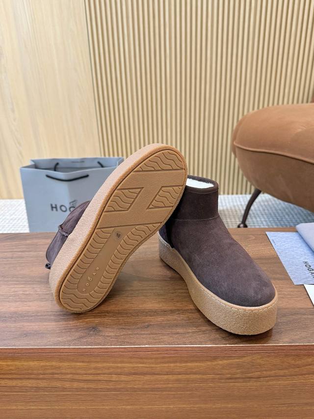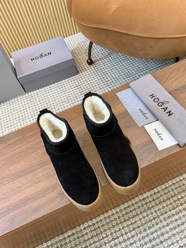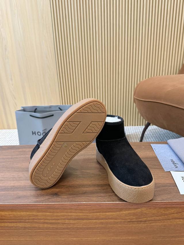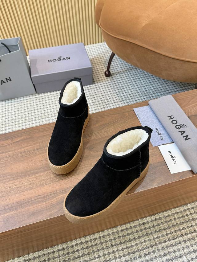 Hogan's newest style at an amazing price! Women's fashionable round-toe genuine leather and wool ankle boots, sporty and casual, with a thick sole that instantly adds 55mm in height. Hand-stitched suede calfskin, a modern minimalist aesthetic, a back pull tab, and a high-elastic insole for comfortable warmth and style. A classic and timeless genuine leather ankle boot, a must-have for every autumn and winter. Sizes 35-40 available. (DDD)