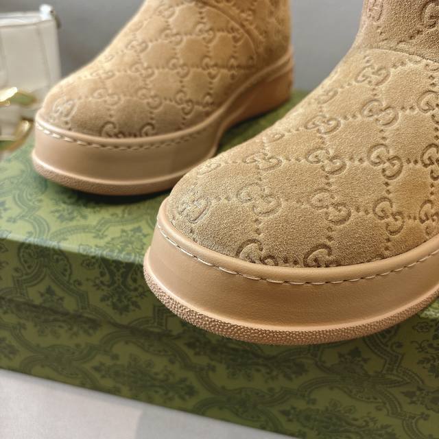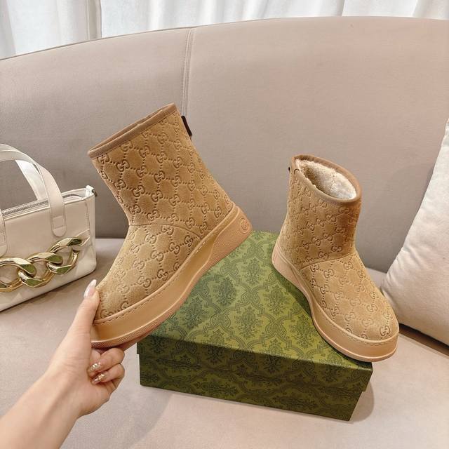 Hot Selling Gg New Women's Ankle Boots & Wool Boots. These Cruise boots are both stable and luxurious. The Gg pattern and other details pay homage to the brand's roots. These snow boots feature a cowhide suede upper with a sheepskin lining, a soft PU insole, and a durable, slip-resistant rubber outsole. Sizes 35-42 are available.