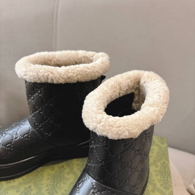 Hot Selling Gg New Women's Ankle Boots & Wool Boots. These Cruise boots are both stable and luxurious. The Gg pattern and other details pay homage to the brand's roots. These snow boots feature a cowhide embossed Gg upper, a wool lining, and a plastic Q-elastic PU sheepskin insole for comfort and warmth. The rubber foam outsole is slip-resistant and durable. Sizes 35-42 are available.