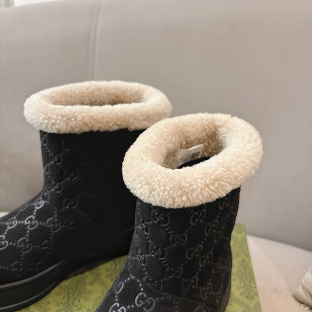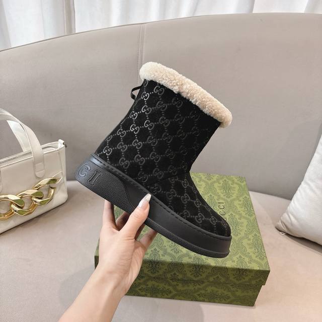 Hot Selling Gg New Women's Ankle Boots & Wool Boots. These Cruise boots are both stable and luxurious. The Gg pattern and other details pay homage to the brand's roots. These snow boots feature a cowhide suede upper with a sheepskin lining, a soft PU insole, and a durable, slip-resistant rubber outsole. Sizes 35-42 are available.