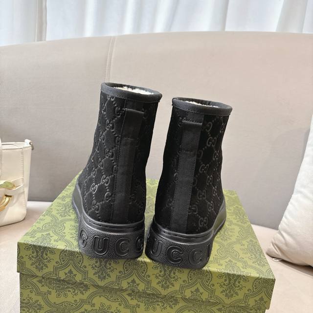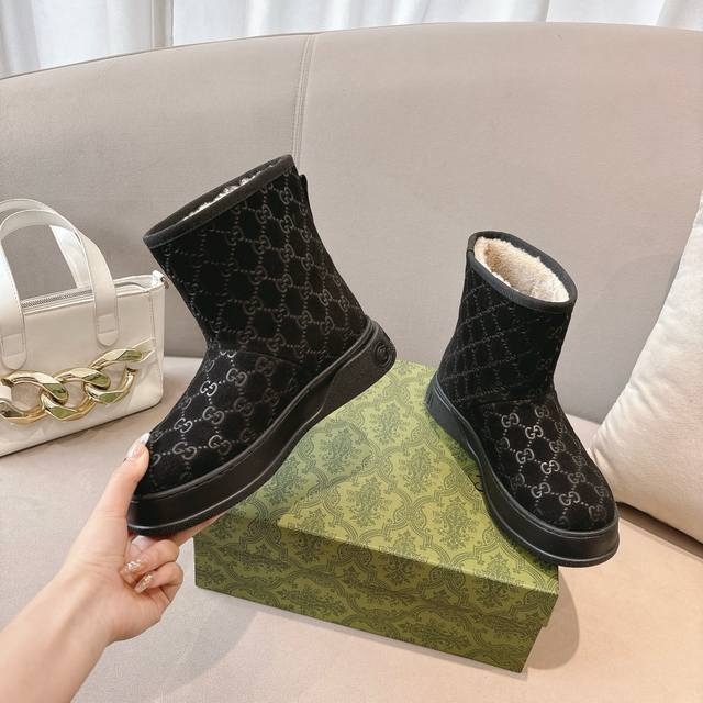 Hot Selling Gg New Women's Ankle Boots & Wool Boots. These Cruise boots are both stable and luxurious. The Gg pattern and other details pay homage to the brand's roots. These snow boots feature a cowhide suede upper with a sheepskin lining, a soft PU insole, and a durable, slip-resistant rubber outsole. Sizes 35-42 are available.