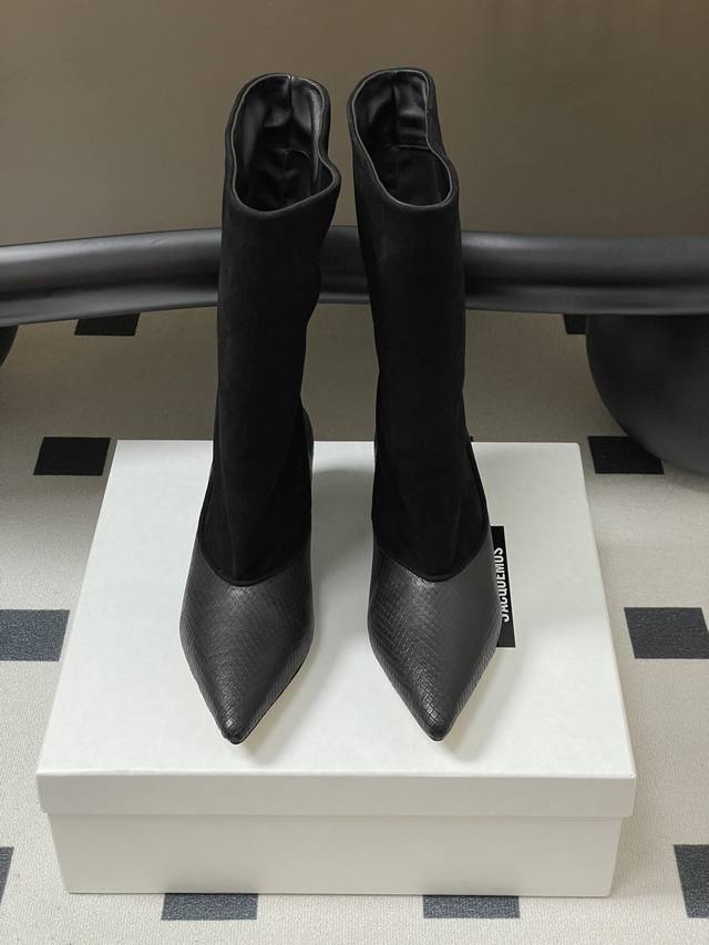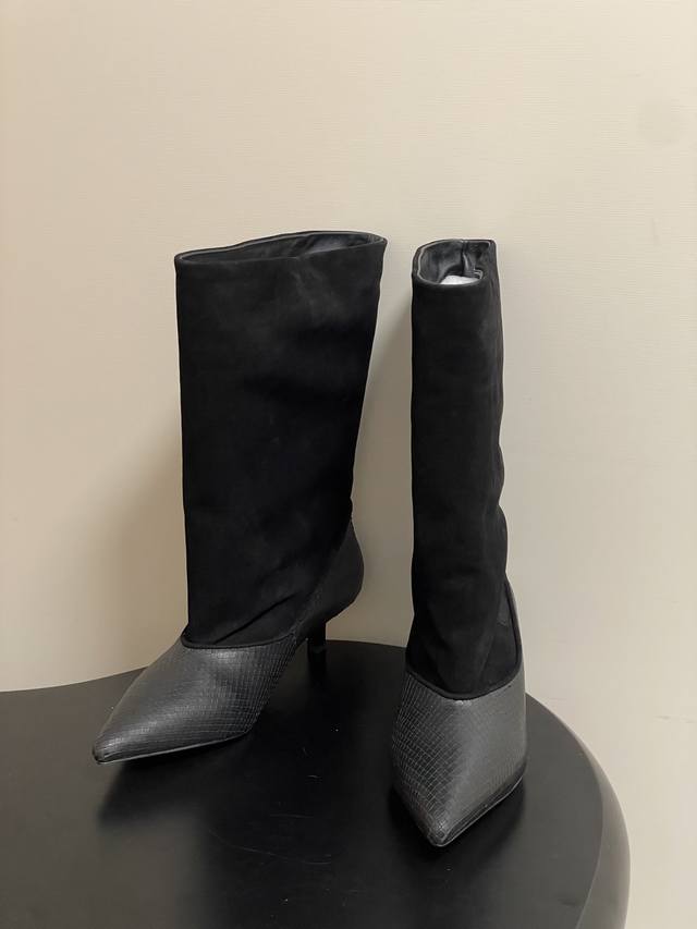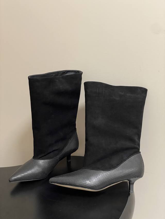 The suede material is soft and textured, while snakeskin leather adds a touch of wildness and sophistication. The patchwork of the two materials is exquisite, with a natural color transition, enhancing the overall design's layering. The pointed toe is sleek and stylish, while the stiletto heel enhances feminine elegance. The mid-calf boot style seamlessly transitions between trousers and skirts, making it suitable for a wide range of occasions.