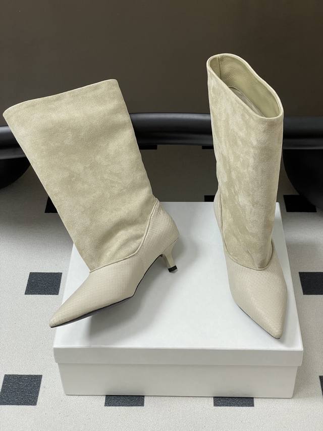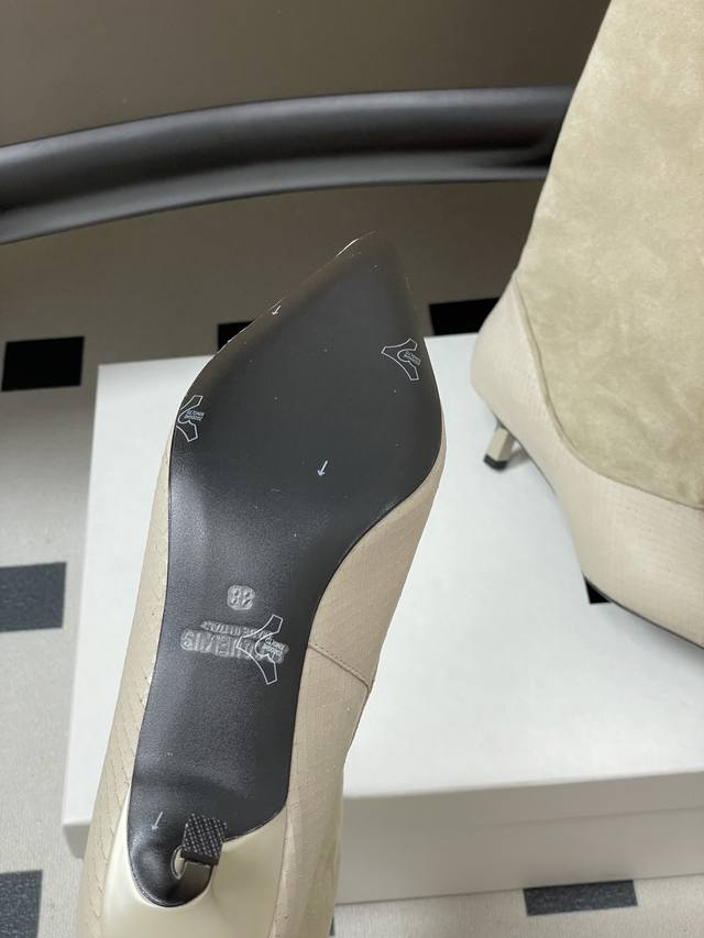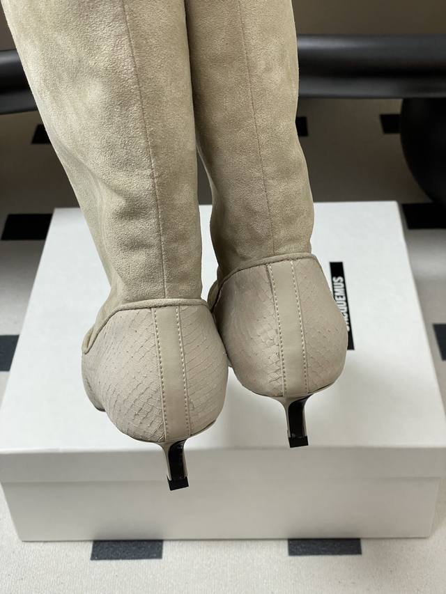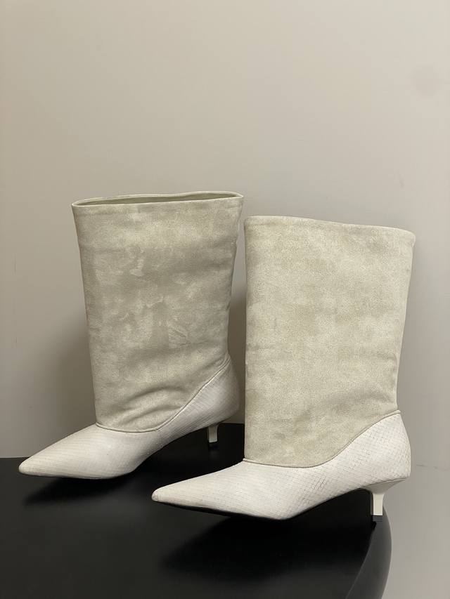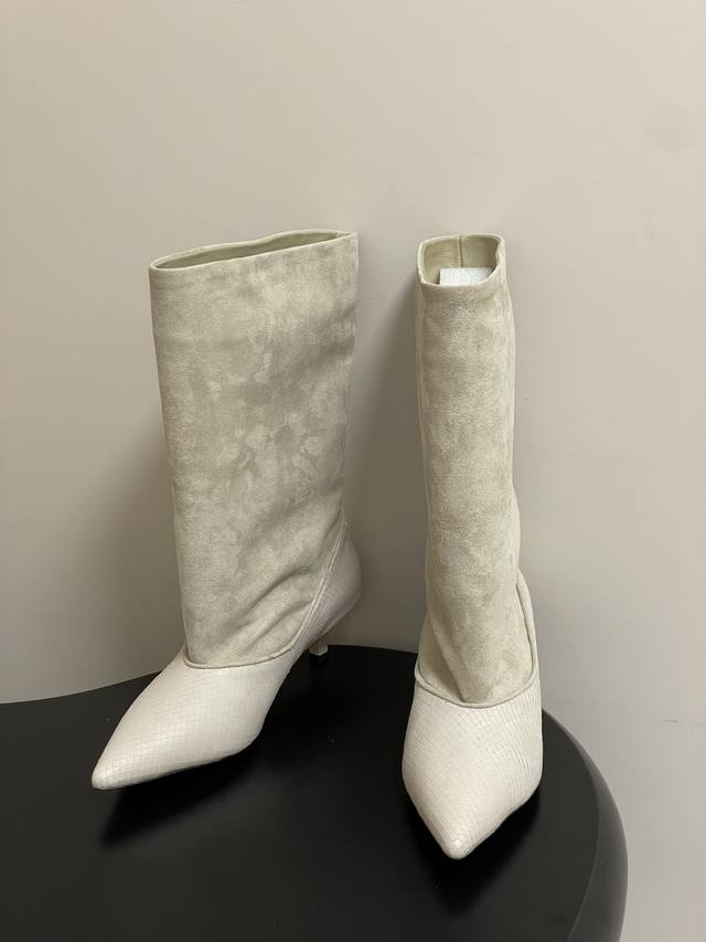 The suede material is soft and textured, while snakeskin leather adds a touch of wildness and sophistication. The patchwork of the two materials is exquisite, with a natural color transition, enhancing the overall design's sophistication. The pointed toe is sleek and stylish, while the stiletto heel enhances feminine elegance. The mid-calf boot style seamlessly transitions between trousers and skirts, making it suitable for a wide range of occasions.