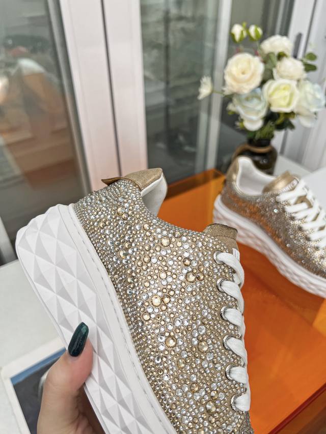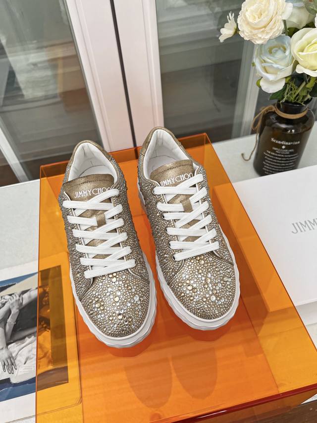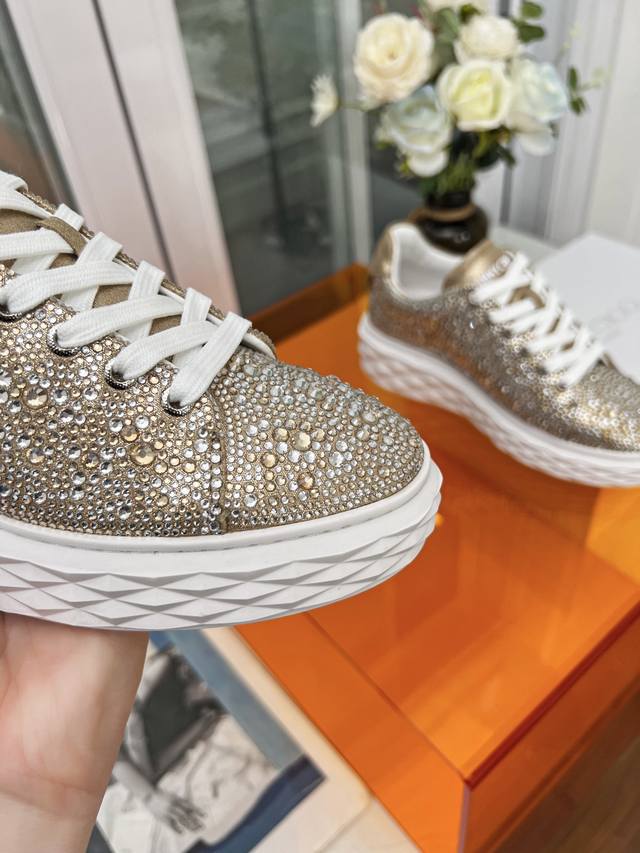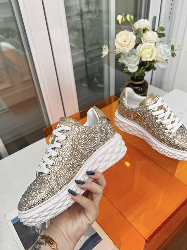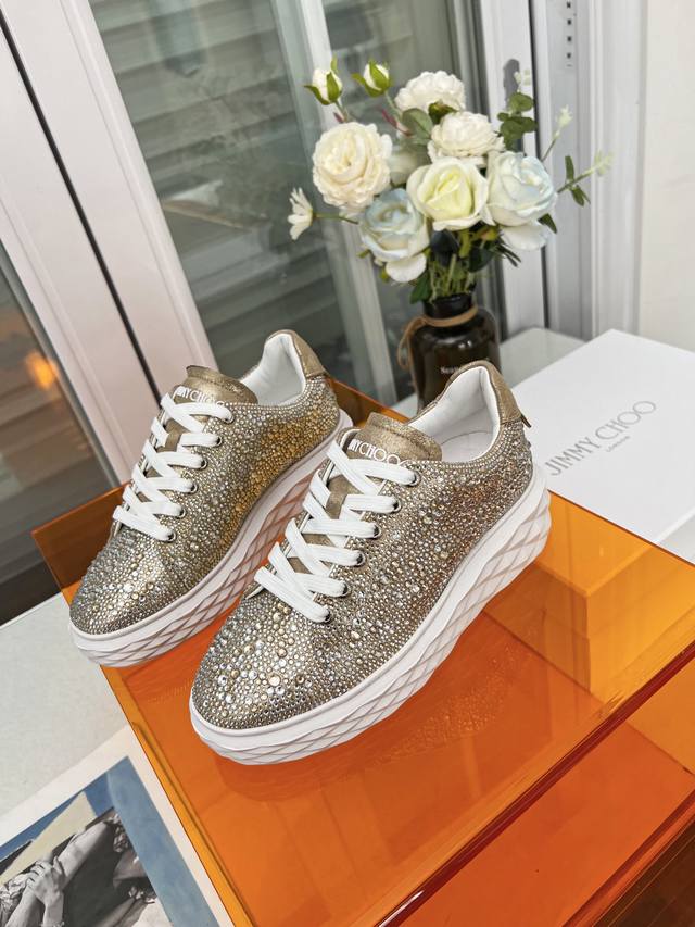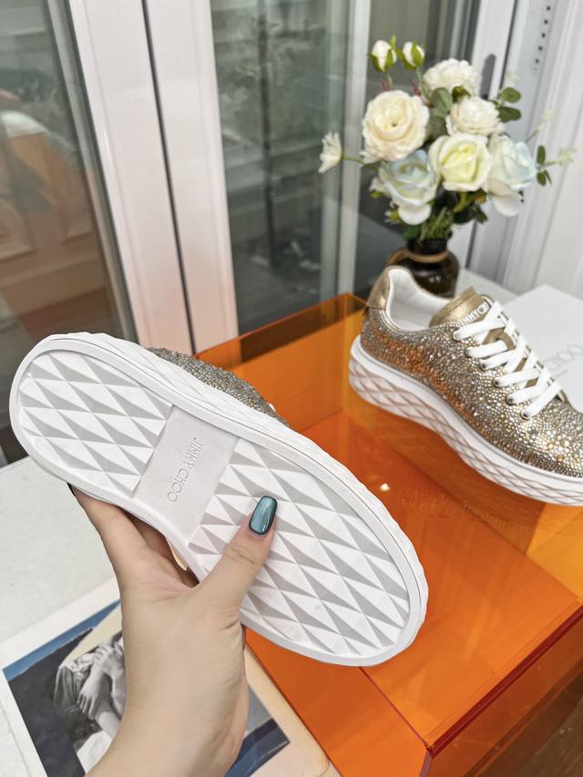 Jimmy Choo Women's Diamond Sneakers Size: 34-41 (True Size 34.41, custom-made, no returns or exchanges) Jimmy Choo 2026 Spring/Summer Diamond Sneakers New Arrival. The upper is made of original imported cowhide, and the sole features the brand's signature diamond-like multi-faceted cut for a three-dimensional look. The gradually thinning sole design adds height without any visual pressure, making them more comfortable to wear. A stylish, comfortable, versatile, and luxurious Diamond sneaker worth owning! Material: Original imported top-grain cowhide (Grease) Lining: Original custom breathable Lycra Insole: Sheepskin Outsole: Original glass glue combination sole.