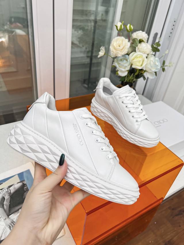 Jimmy Choo Women's Size: 34-41 (True Size 34.41, custom-made, no returns or exchanges) Jimmy Choo 2026 Spring/Summer Diamond Sneaker Collection. The upper is made of original imported cowhide, and the sole features the brand's signature diamond-like multi-faceted cut for a three-dimensional look. The gradually thinning sole design adds height without any visual pressure, making it more comfortable to wear. A stylish, comfortable, versatile, and luxurious Diamond sneaker worth owning! Material: Original imported top-grain cowhide (Grete) Lining: Original custom breathable Lycra Insole: Sheepskin Outsole: Original glass glue combination sole.