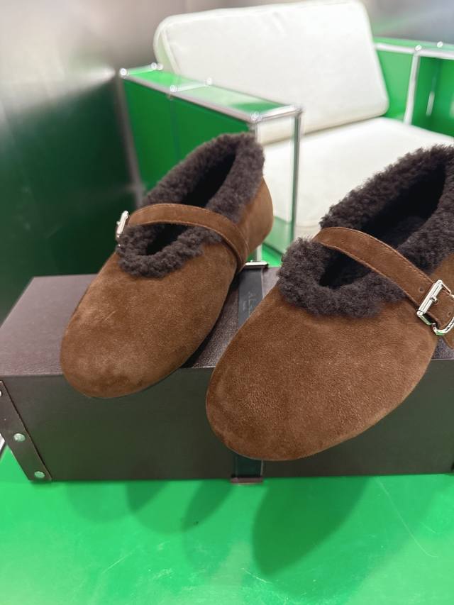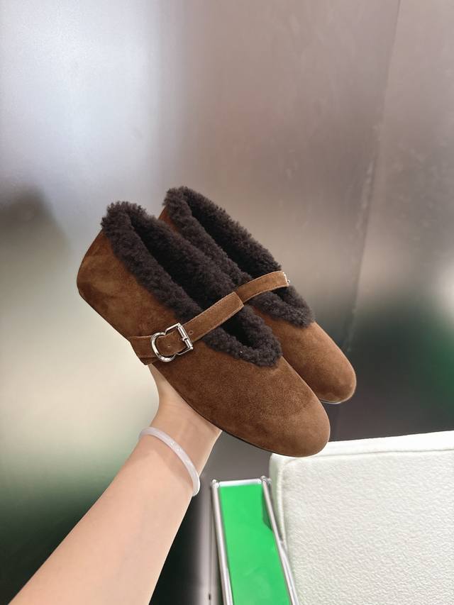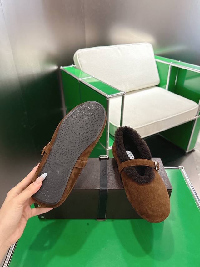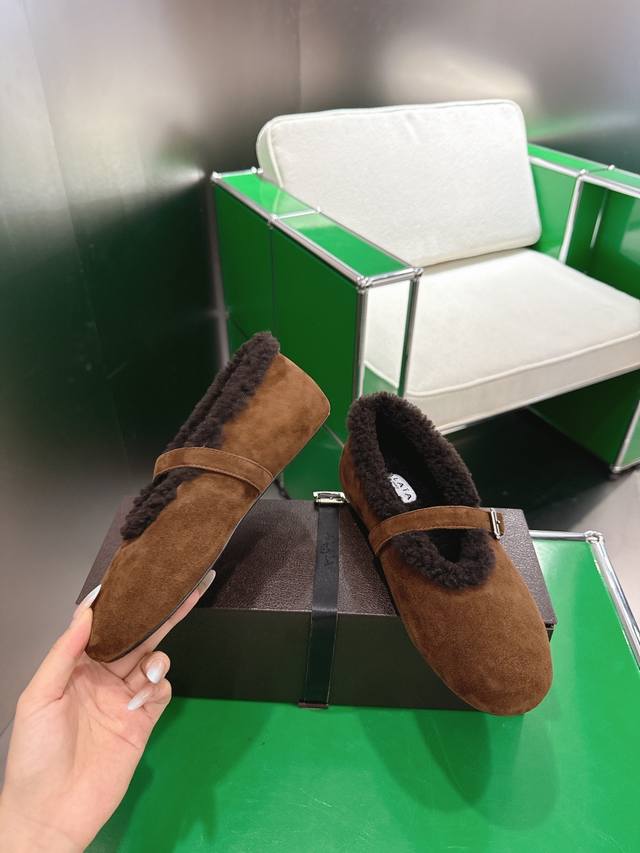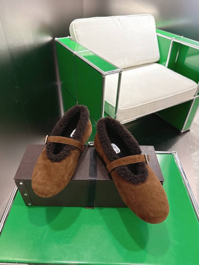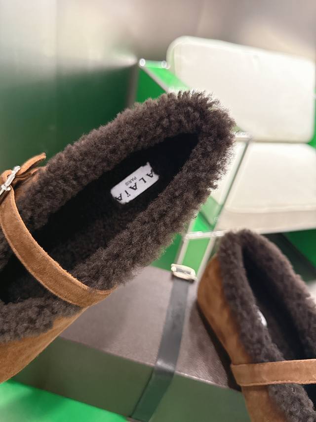 K052Alaia Autumn/Winter New Wool Mary Jane Ballet Shoes. Made with suede upper and lamb's wool lining for superior warmth; the single-strap design with metal buckle enhances the overall quality, combining retro and sophisticated elements. The round toe is forgiving, the flat sole ensures comfort, and the plush edges at the opening add a touch of cuteness. The style is somewhere between casual and retro. Upper: Suede upper; Lining: Wool; Outsole: Original rubber non-slip outsole; Sizes: 35-42 (40, 41, 42 - Custom sizes are non-refundable).