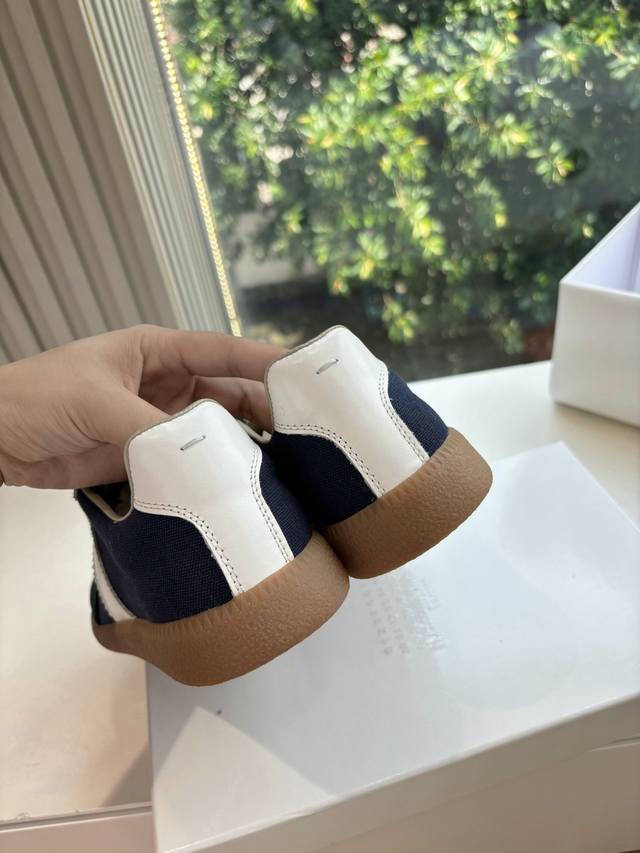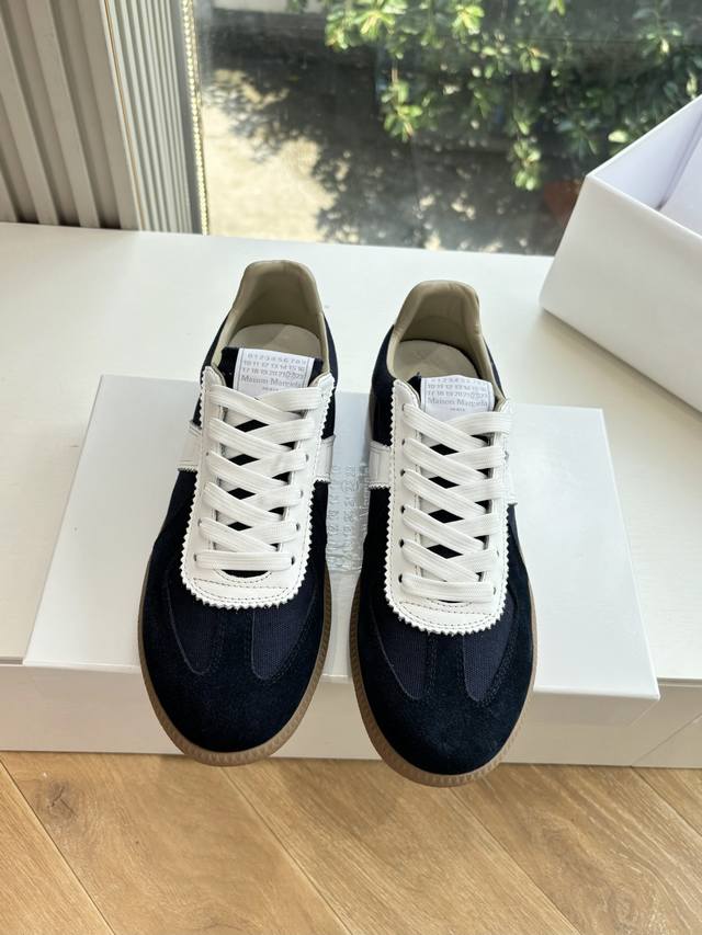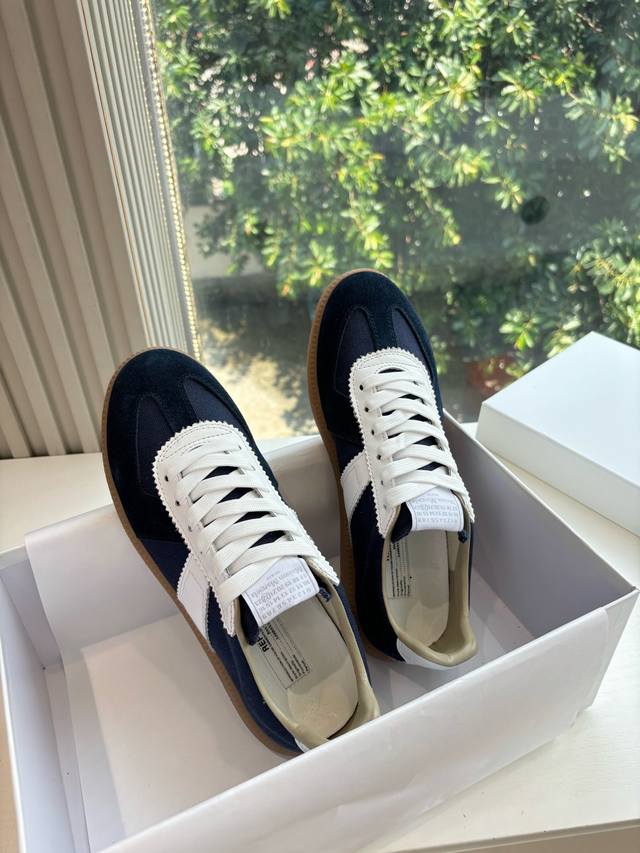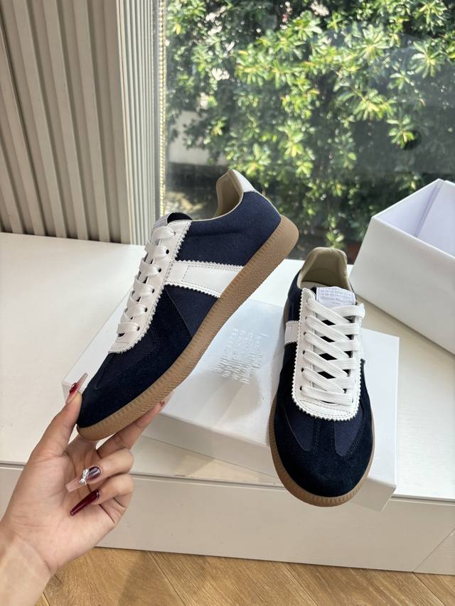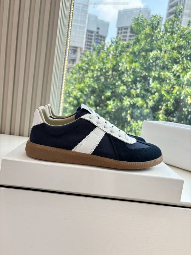 Maisonmargiela Mm6 German training casual shoes, a designer brand known for its innovative designs. A mid-range luxury brand, these shoes are incredibly versatile and comfortable. This German training shoe continues the classic T-shaped genuine leather patchwork design, meticulously refined by the design team to deliver the most authentic military feel. The combination of soft, supple top-grain cowhide and the texture of suede provides exceptional softness and comfort while maintaining excellent breathability. Comfort and quality go hand in hand, easily adaptable to any season and any outfit. Material: Cowhide. Sizes: 35-40 (Women's 39, Men's 45).