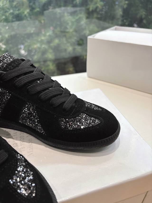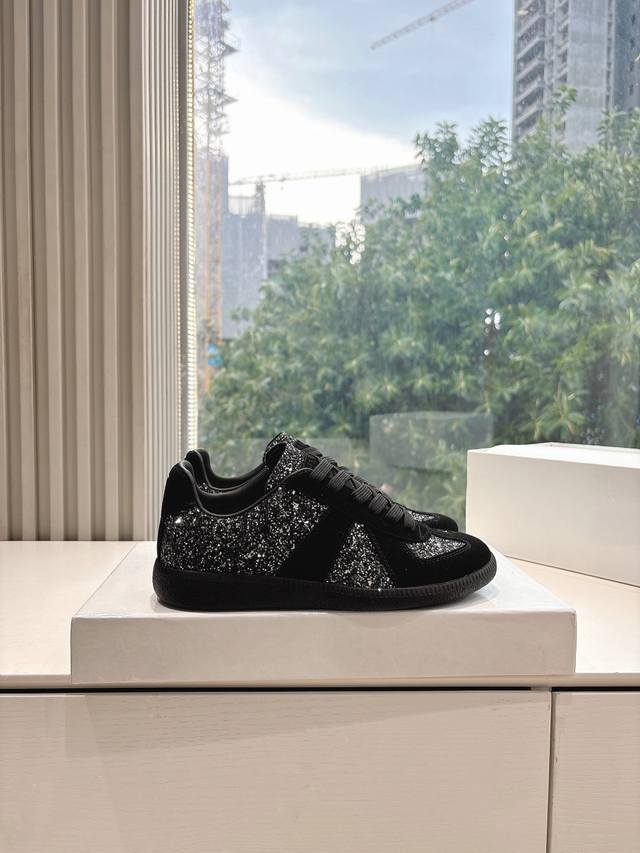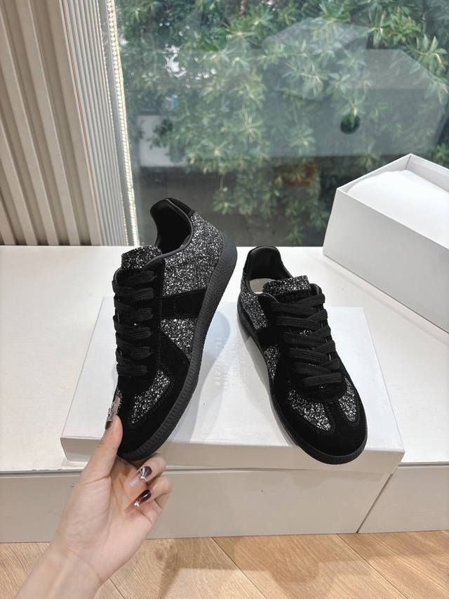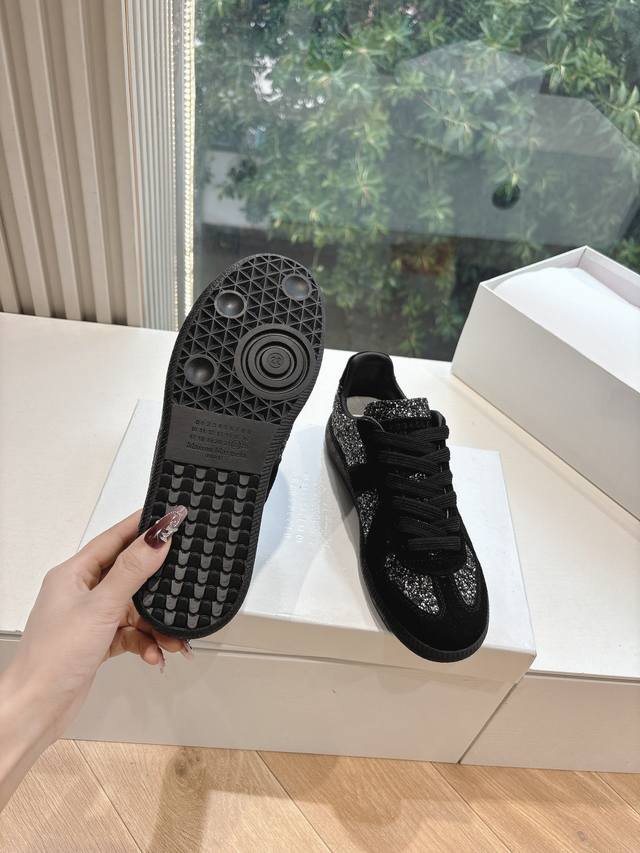 Maisonmargiela Mm6 German training casual shoes, a designer brand known for its innovative designs. A mid-range luxury brand, these shoes are incredibly versatile and comfortable. This German training shoe continues the classic T-shaped genuine leather patchwork design, meticulously refined by the design team to give you the most authentic military feel. The combination of soft, supple top-grain cowhide and the texture of suede provides exceptional softness and comfort while maintaining good breathability. Comfort and quality go hand in hand, easily adaptable to any season and any outfit. Material: Cowhide. Sizes: 35-40 (Women's 39, Men's 45).