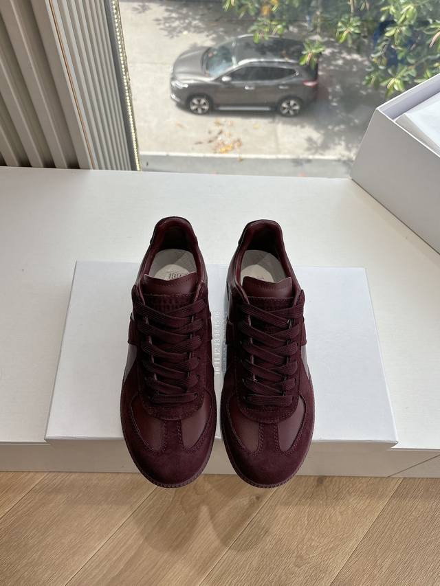 Maisonmargiela Mm6 German training casual shoes, a designer brand known for its innovative designs. A mid-range luxury brand, these shoes are incredibly versatile and comfortable. This German training shoe continues the classic T-shaped genuine leather patchwork design, meticulously refined by the design team to give you the most authentic military feel. The combination of soft, supple top-grain cowhide and the texture of suede provides exceptional softness and comfort while maintaining good breathability. Comfort and quality go hand in hand, easily adaptable to any season and any outfit. Material: Cowhide. Sizes: 35-40 (Women's 39, Men's 45).