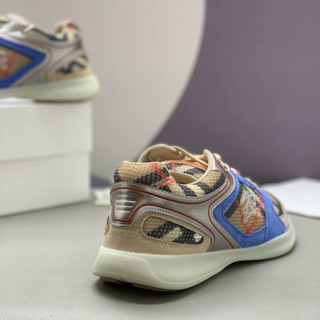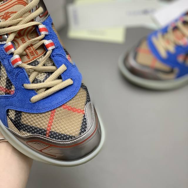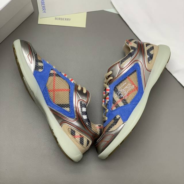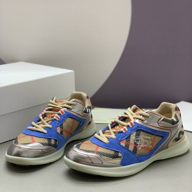 . These shoes are full of British style, with a suede upper and unique checkered mesh panels. Inspired by sporty design, they are paired with a lightweight sole and embellished with the equestrian knight logo and brand logo appliqu