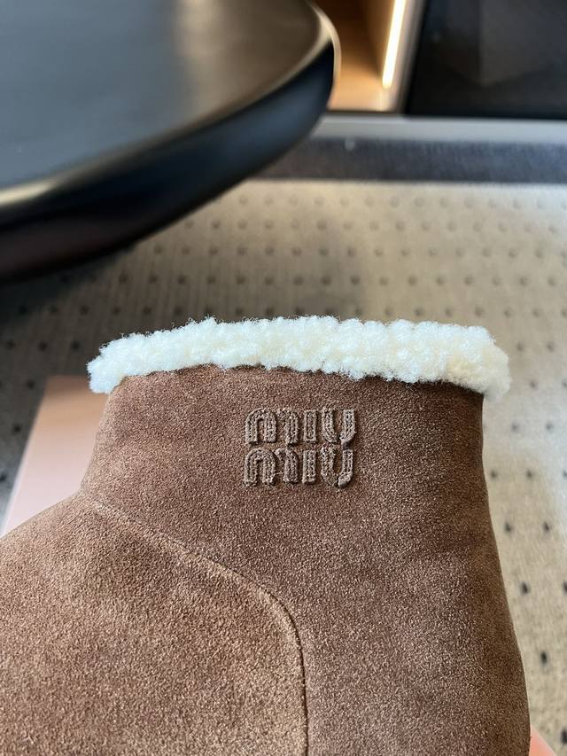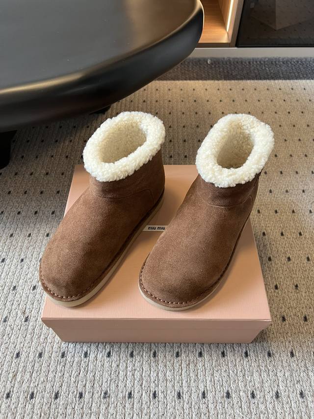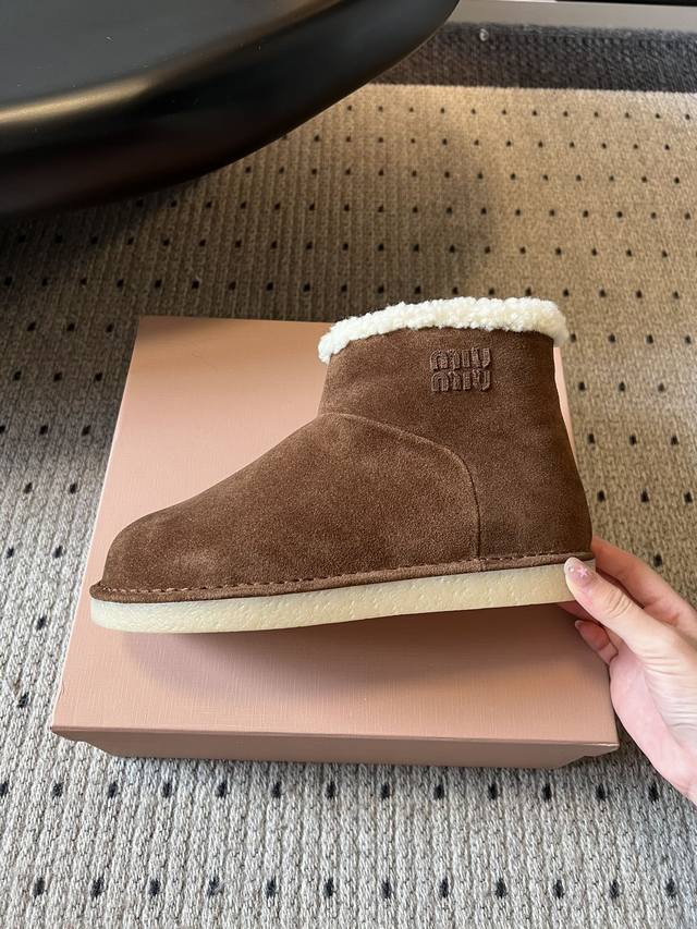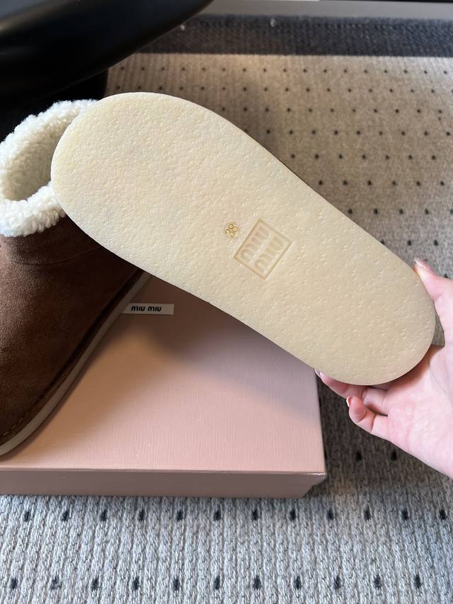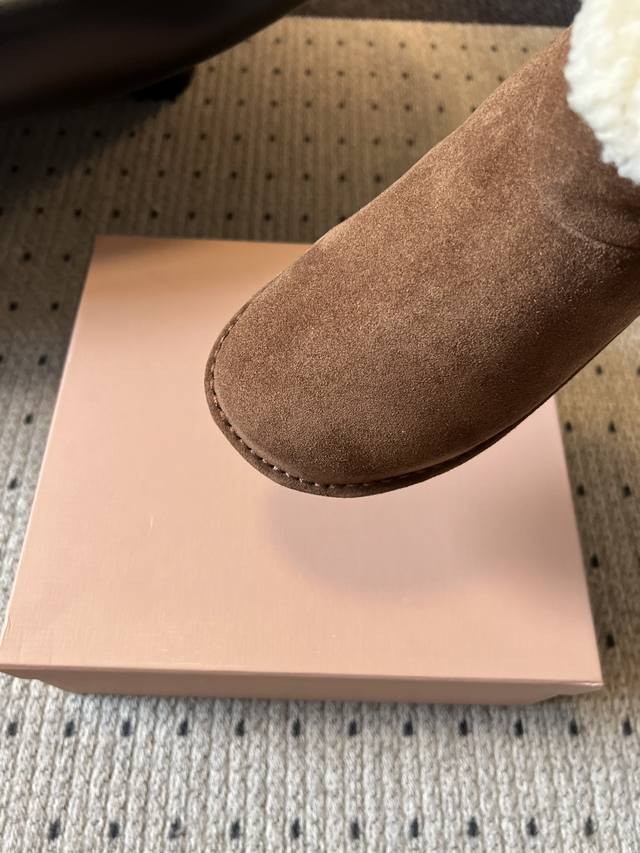 Miu Mi* 25Fw Deck Shoes Plush Warm Snow Boots This is a snow boot available in light beige and dark brown. The upper is made of fine suede, with a soft, fluffy white plush trim around the ankle, adding a touch of style while providing warmth. For styling, the light beige version pairs well with light-colored jeans and knit skirts for a fresh and gentle winter look; the dark brown version is suitable for pairing with dark-colored cargo pants and wool skirts for a retro yet warm style, suitable for both everyday wear and winter commutes. Upper: High-gloss cow suede Lining: Wool Outsole: Rubber Outsole Height Increase: 4cm Size: 35-40 Size 40 (Custom sizes are non-refundable)