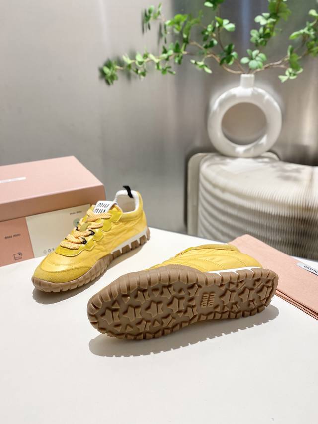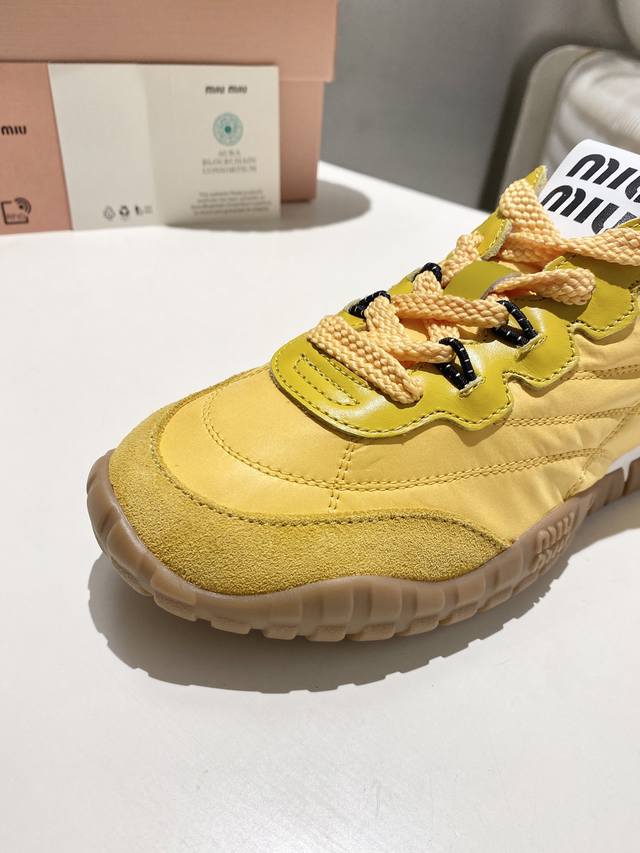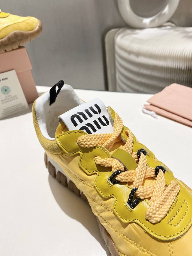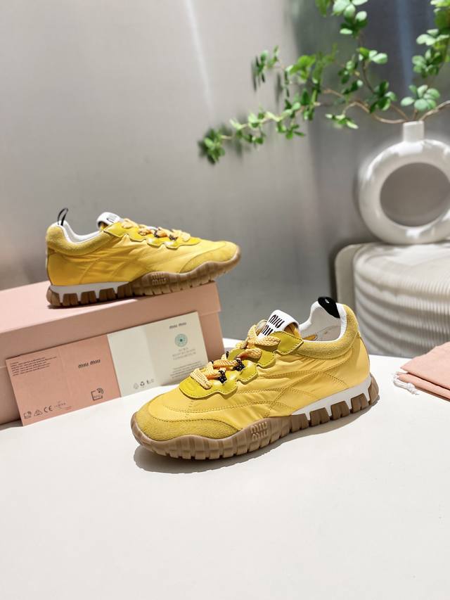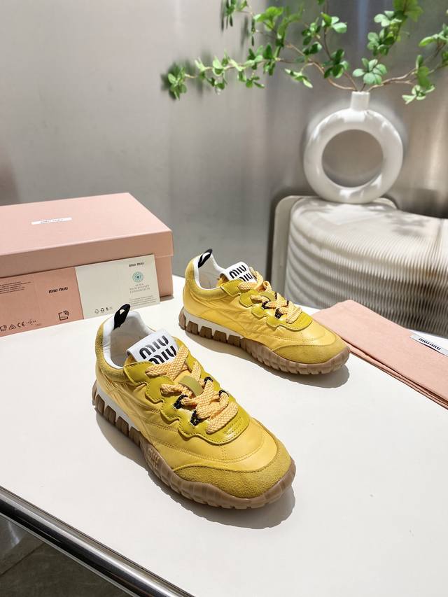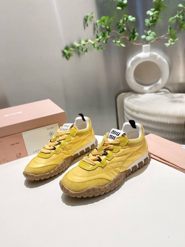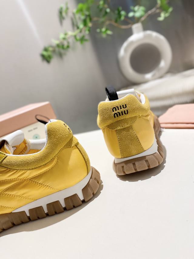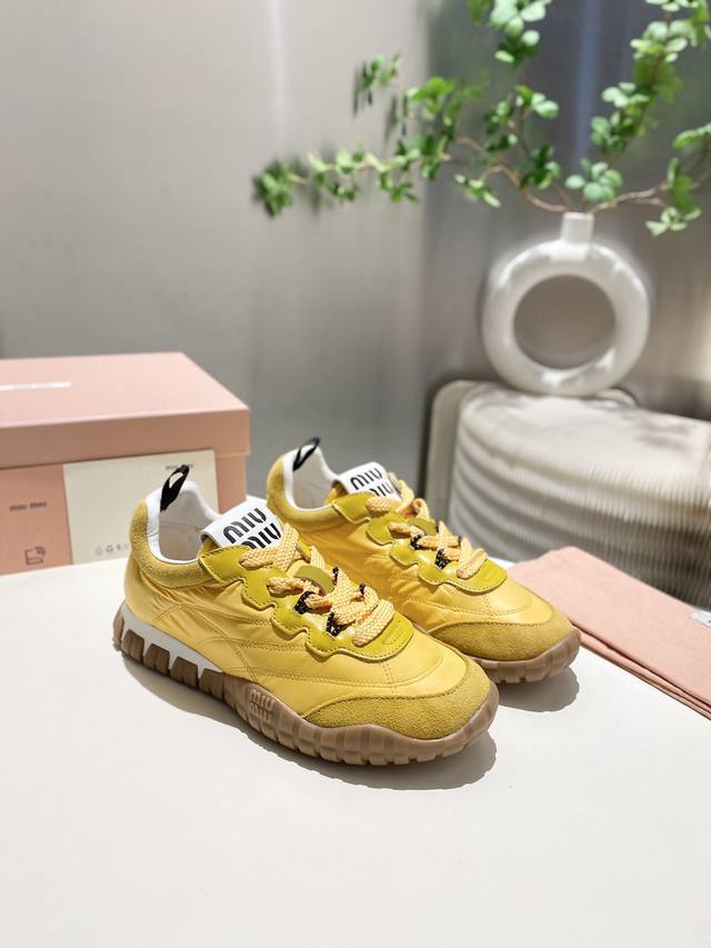 Miu Miu 2025 Forrest Gump Casual Sneakers, Spring/Summer New Arrival, a trendy and bold design. The Miu style is incorporated into the simple lines of this chunky canvas sneaker, with a unique logo adorning the tongue and back, accented by a retro chunky sole design. Bold, innovative, and avant-garde, comfortable and breathable, the color is also very versatile. Sizes 34-41. 34 & 41 are available for custom orders.