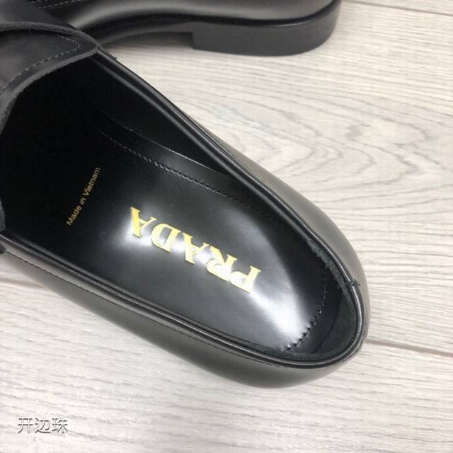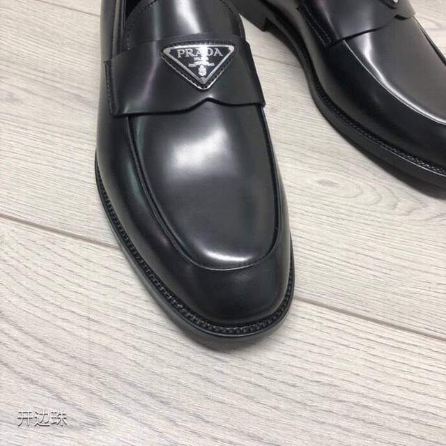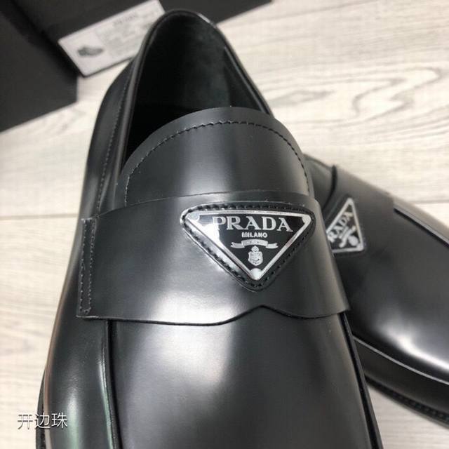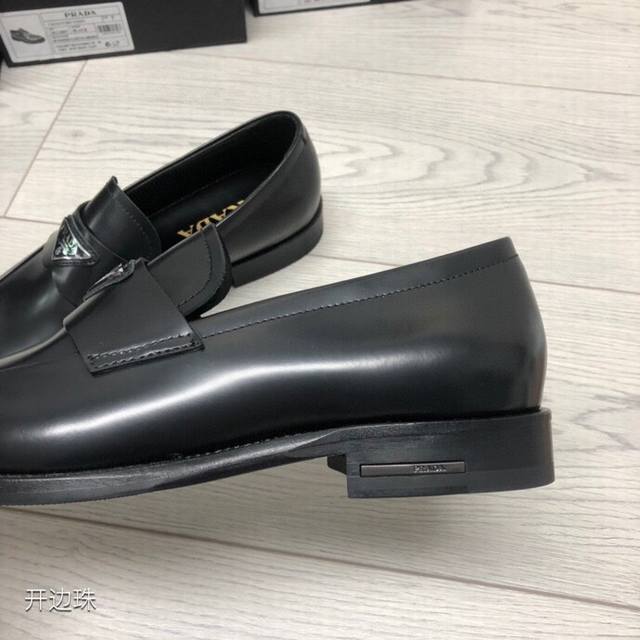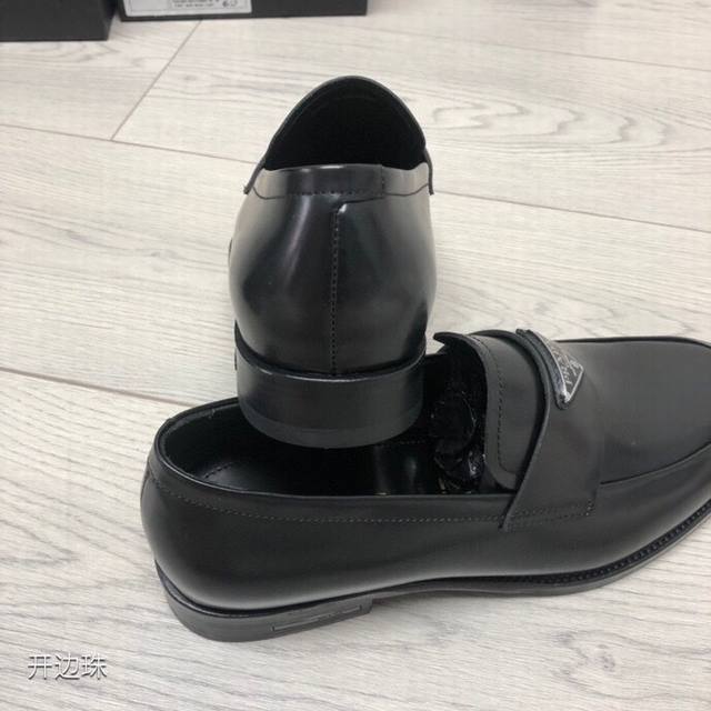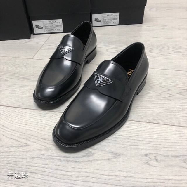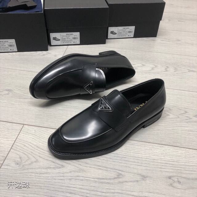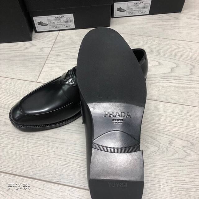 New arrival, prad* premium all-season shoes. Imported from Italy, with open-edge leather and classic triangle logo buckle. Soft leather lining and leather footbed. Original leather outsole with added rubber inserts. Ready to wear. Super comfortable, a must-have for men. Compare with standard J leather shoe sizes: 39, 40, 41, 42, 43, 44. Complete package.