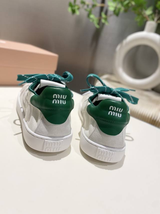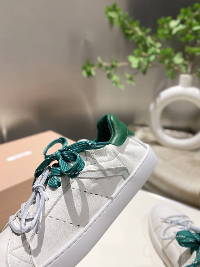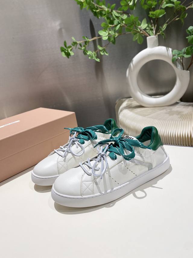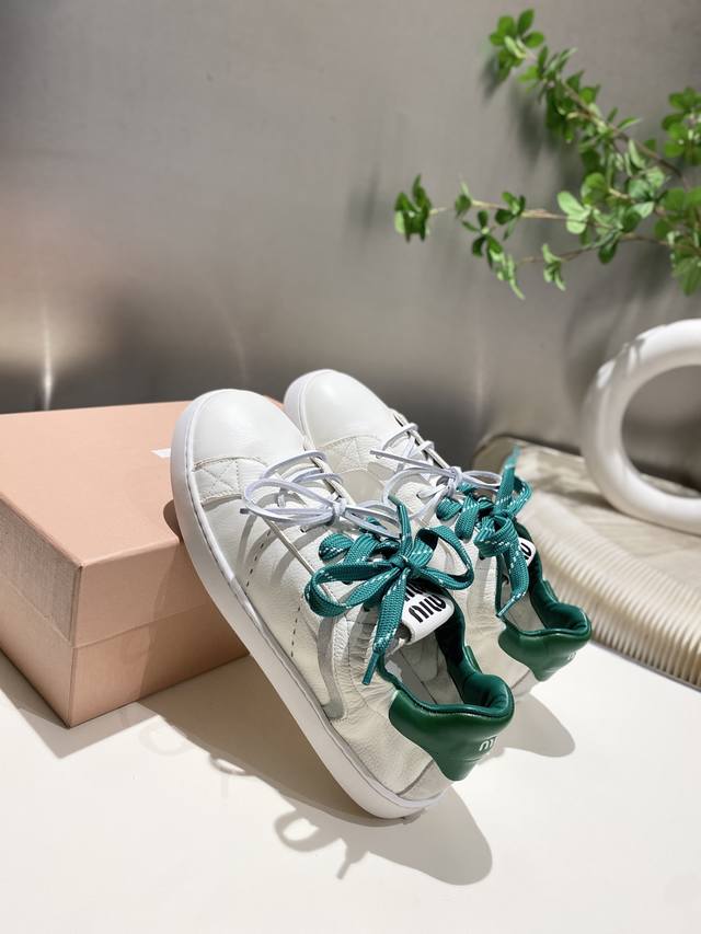 New Miu Miu 2025 Spring/Summer Casual White Sneakers are now available! A key style recommended by the official website, these sneakers feature a simple plaid design and a distinctive tongue. They exude a youthful and sunny vibe, easily paired with long skirts, short skirts, or shorts for a unique style. Features include a super lightweight IP foam sole, top-layer cowhide lining, and a 1:1 replica of the original material with a distressed finish. Sizes 35-39, 34-40, and 41 are available. No returns or exchanges.