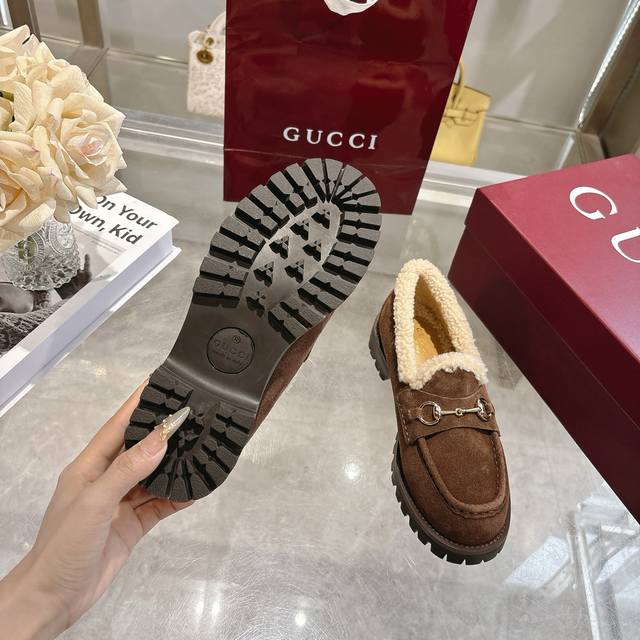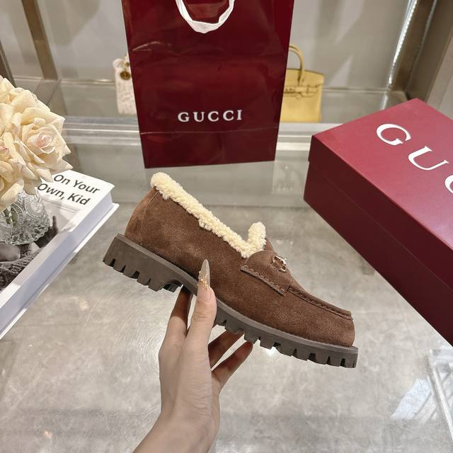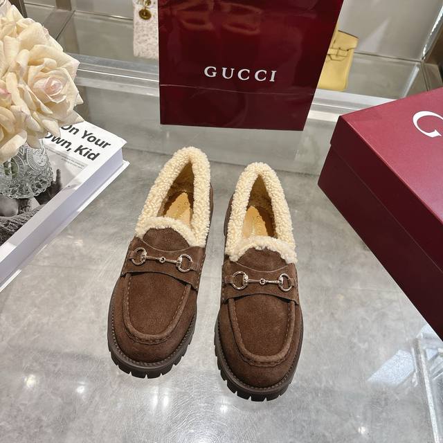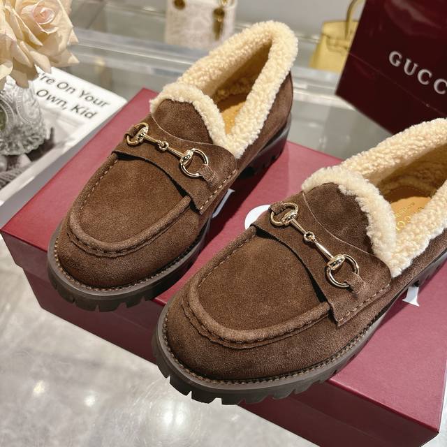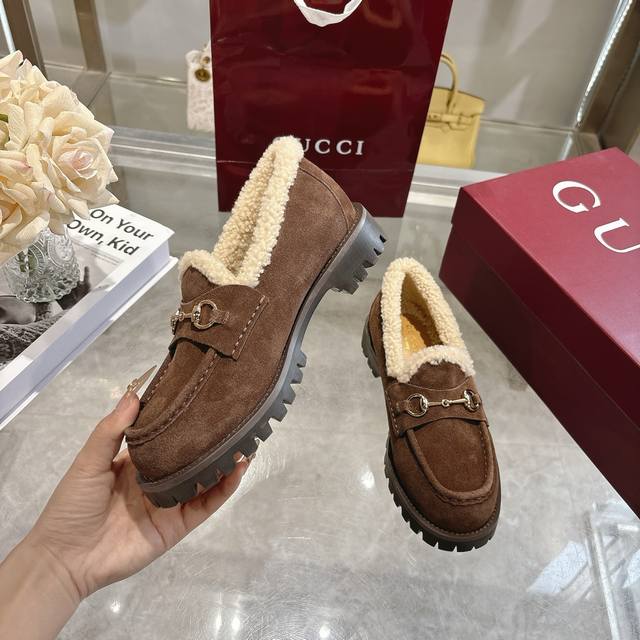 New Winter Women's Horsebit Loafers with Wool Lining DDD Exquisite details infuse these loafers with elegance. Made with smooth suede and a merino wool lining, they exude a refined style. The light gold horsebit adds a touch of brand identity to this classic yet modern design. DDD Coffee-colored suede material DDD Light gold hardware DDD Merino wool lining DDD Horsebit DDD Rubber grooved sole DDD Flat sole DDD Height: 3 cm DDD Italian design DDD Sizes: 36-42 DDD