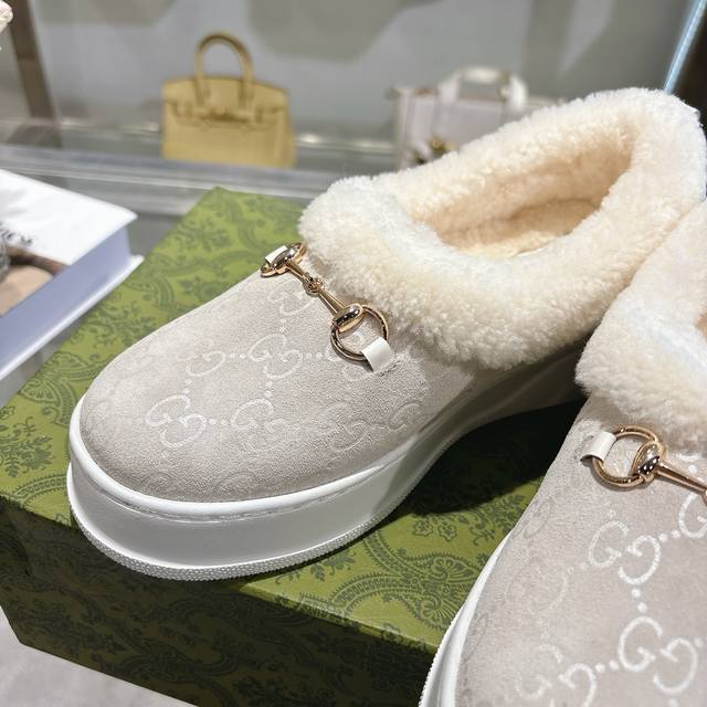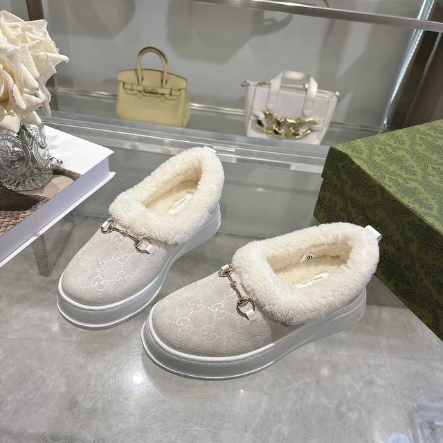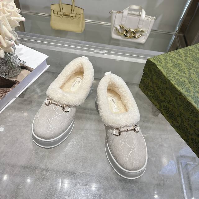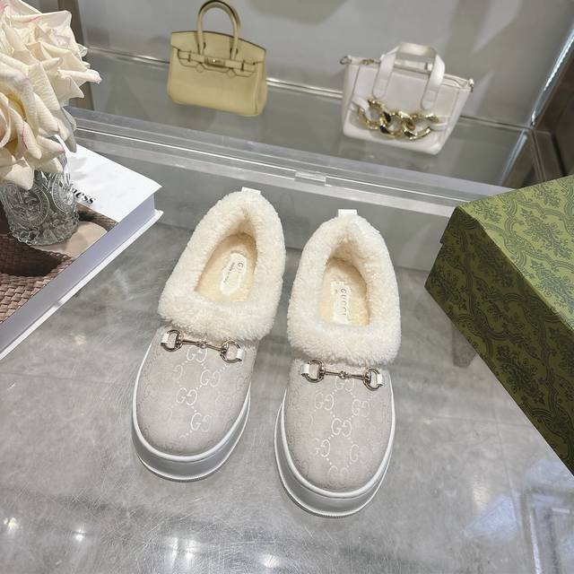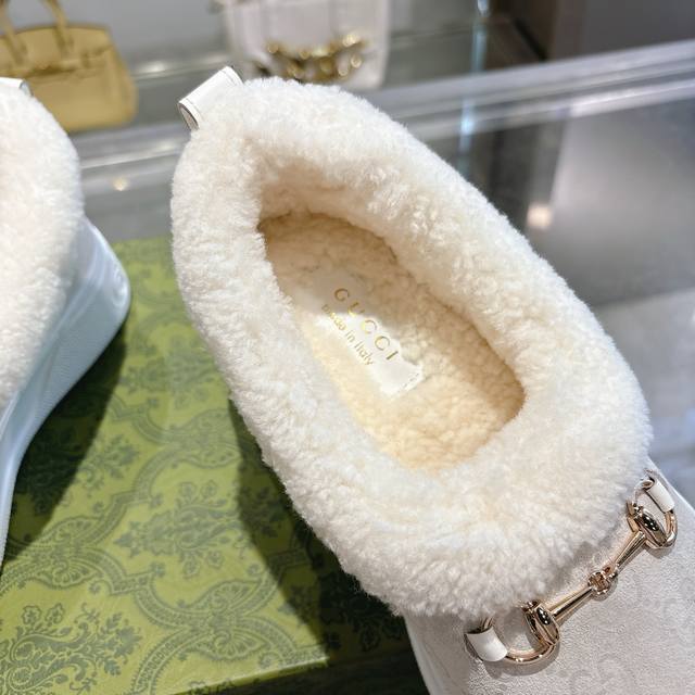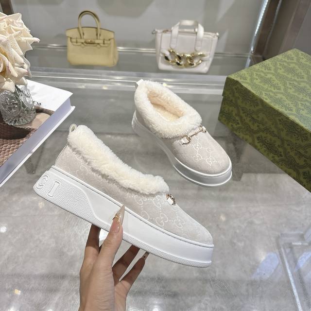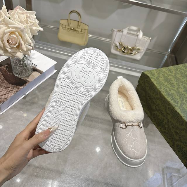 Paris Fashion Week Merino Sheepskin Flat-Top Snow Boots, featuring a suede upper and Australian imported wool lining. These women's boots are crafted from suede, combining comfort with classic heritage. The soft merino wool lining provides a warm and luxurious feel, while the iconic Gg rubber sole, inspired by the brand's classic monogram pattern, adds a bold, modern touch. Features include: suede upper, merino wool lining, Gg rubber foam ultralight sole, flat sole, sizes 36-42.