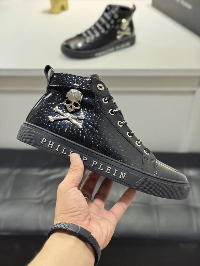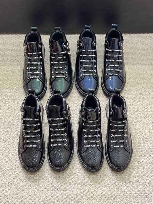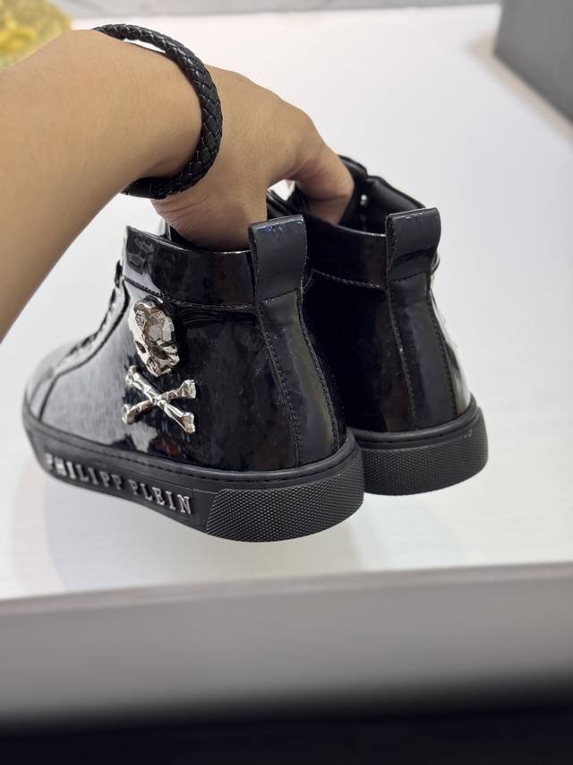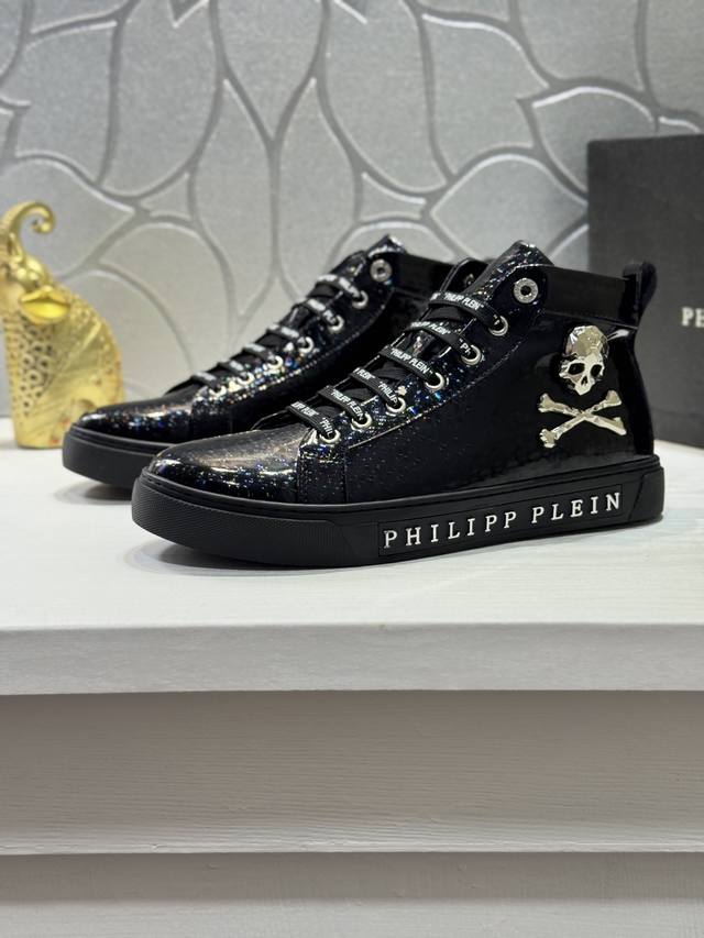 Philipp Plein - Philipp Plein Men's High-Top Casual Shoes. Based on classic design, these shoes feature a streamlined silhouette. They are meticulously crafted with cowhide leather, hardware, and a sheepskin lining, creating a distinct layered look that enhances their style and makes them incredibly durable. Available in sizes 38-44 and 45 (custom sizes available).