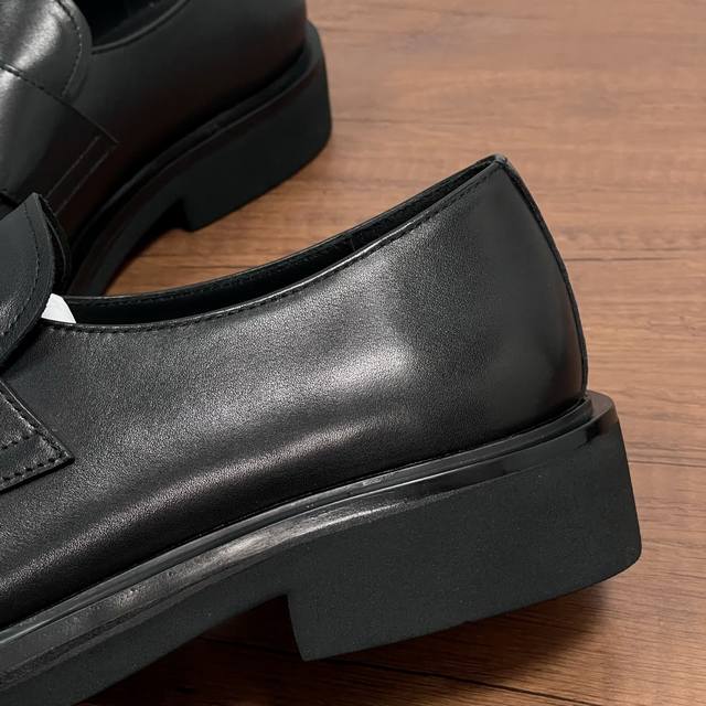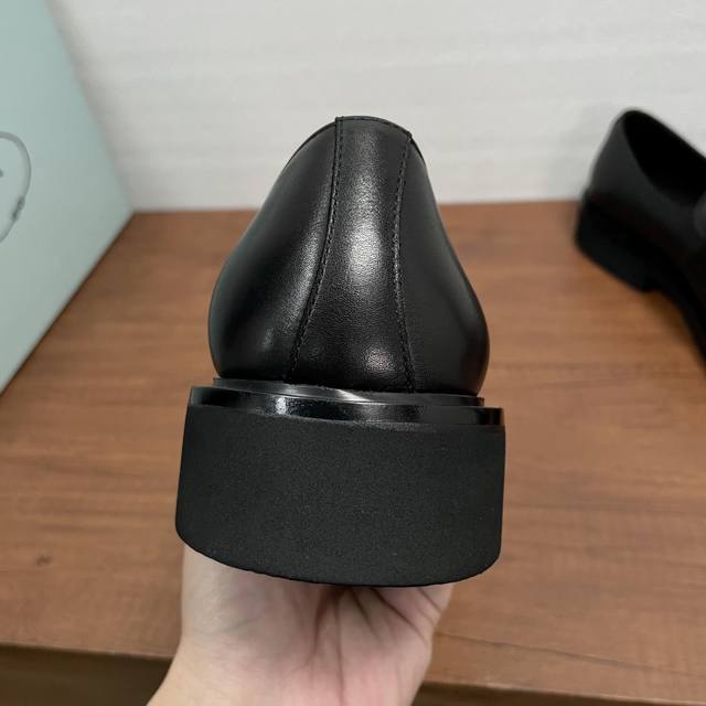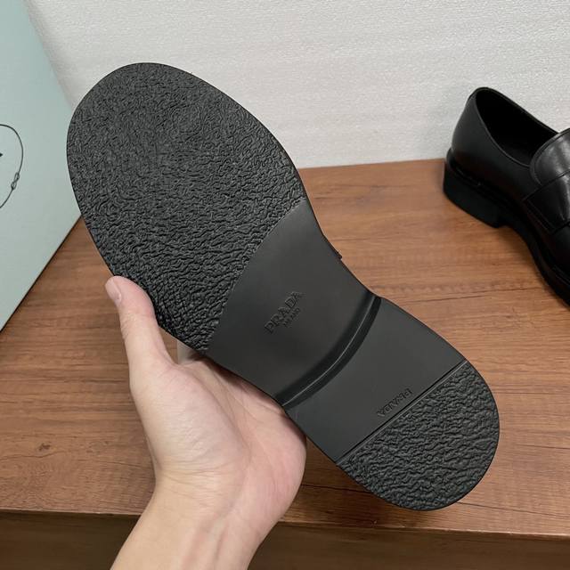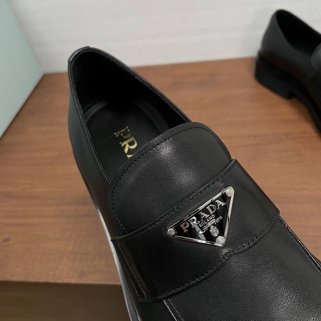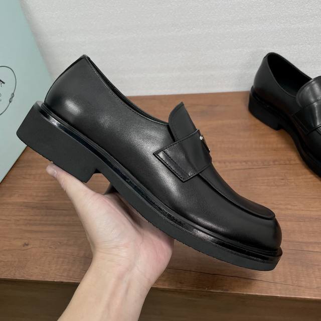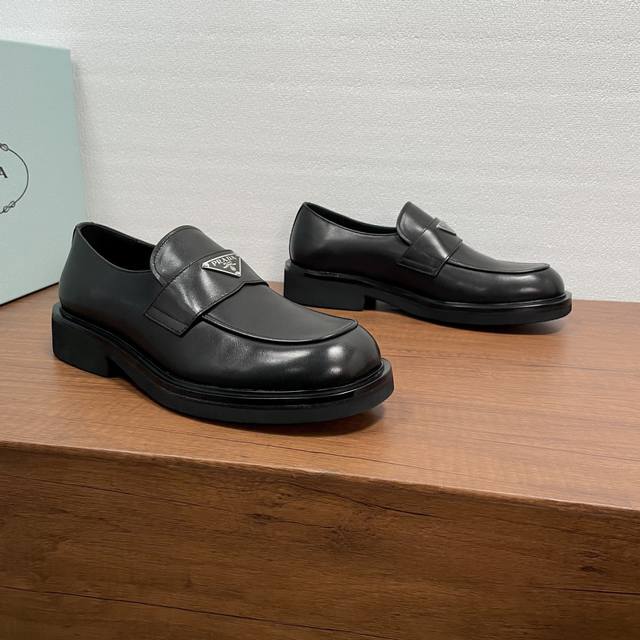 Prada Men's New Leather Loafers (Ddd) These loafers exude elegance and modern style. Crafted from black calfskin and glossy, hand-brushed split-edge leather, they feature the iconic triangular metal enamel logo detail on the front horizontal trim. Imported lathe stitching ensures exquisite detailing. The slip-on design combines a genuine leather welt with a vulcanized, non-slip, durable, and lightweight EVA foam outsole. The full calfskin and gold-stamped logo leather insole further enhance the masculine appeal. Classic and stylish, comfortable and durable! Comes with original box and dust bag! (Ddd) Sizes: 39-40-41-42-43-44 (Standard leather shoe size 38, 45). Custom orders are non-refundable. (Ddd) Item Number: Xy131 Triangular Logo Black Calfskin (Ddd)