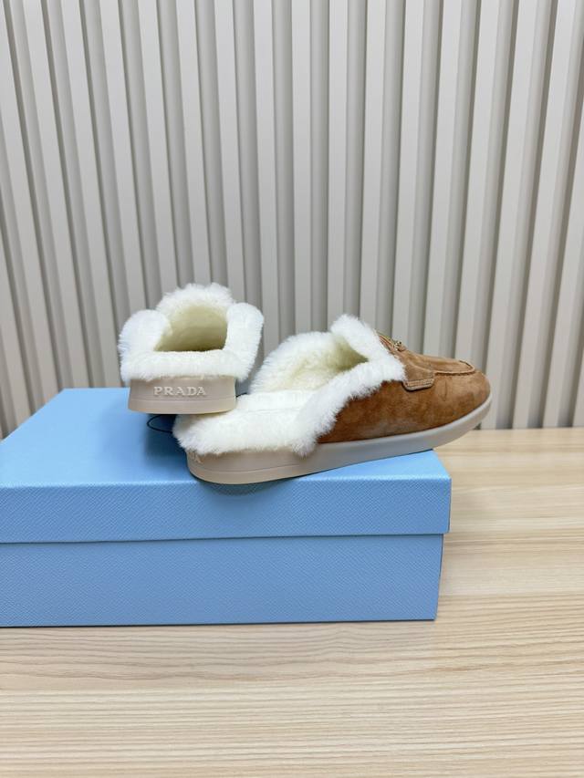 Prada wool slippers with closed toe, officially updated with couple styles! Featuring the classic triangle buckle design, these slippers are incredibly stylish. The all-wool lining and insole provide excellent warmth, keeping you cozy even in the coldest winter days. The comfortable TPU sole makes them exceptionally comfortable, like walking on clouds. Whether at home or out, they're the perfect choice. Wear them with your partner, show off your love, and become the fashion focus on the street. This winter, let Prada wool slippers accompany you, offering both warmth and style. Grab yours now! Material: Imported suede cowhide Lining: Australian imported sheepskin Outsole: Original TPU membrane outsole Women's sizes: 35-41 (41 custom-made) Men's sizes: 39-45 (45 custom -made)