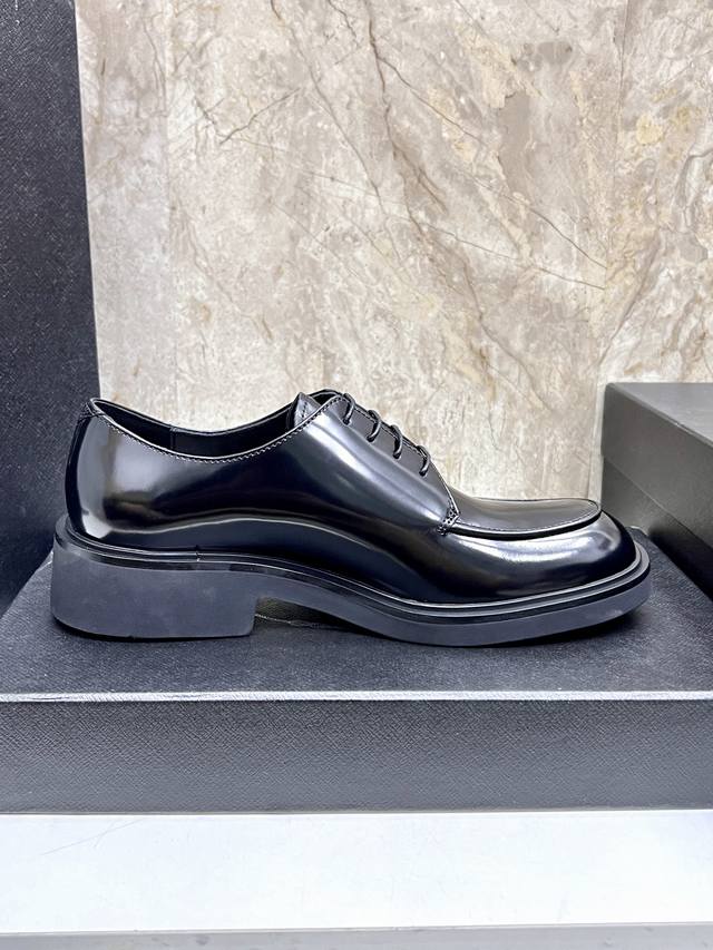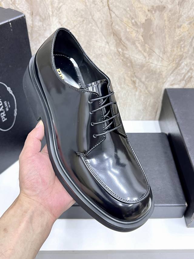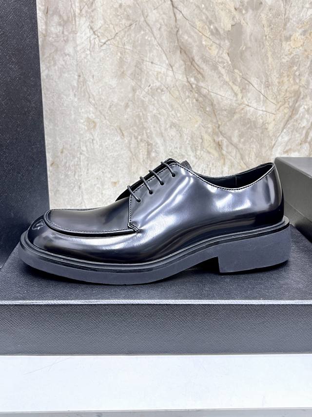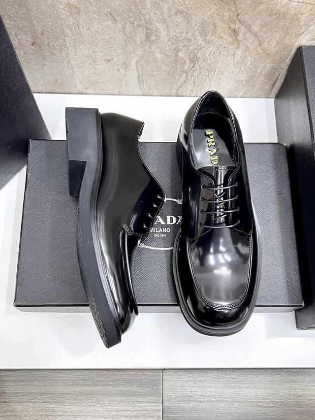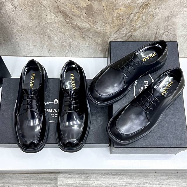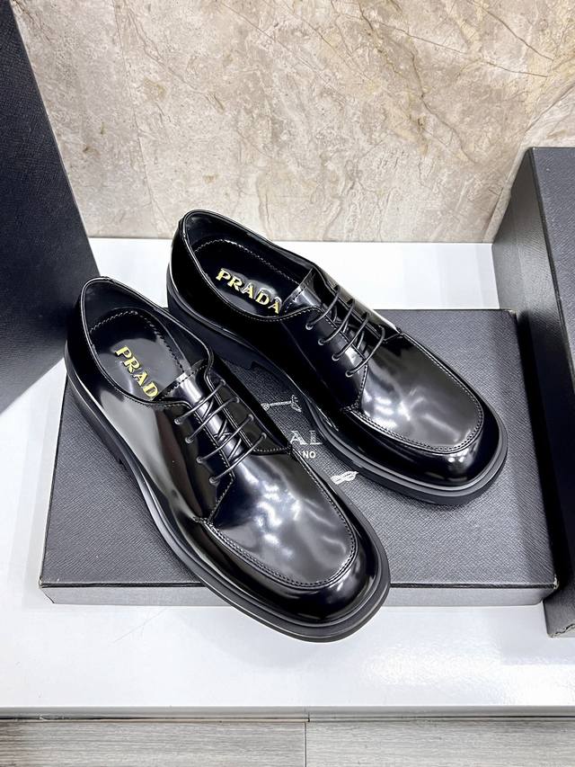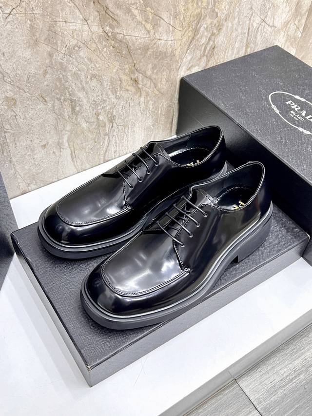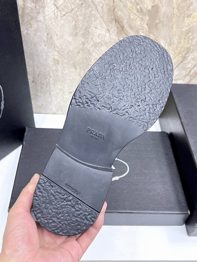 prad*'s high-end classic men's loafer, featuring a fresh design with new volume and refined details. Crafted from imported open-edge pebbled cowhide leather, it's adorned with a triangular logo, welt stitching, and a rubber sole with distinctive notched details. This piece features a retro design, showcasing a mix-and-match aesthetic. The retro upper features squared lines, contrasting with a chunky, modern sole, blending diverse silhouettes with traditional design elements. The triangular logo and glossy leather add signature touches to the shoe. Glossy leather is a classic brand material, retaining its luster over time.