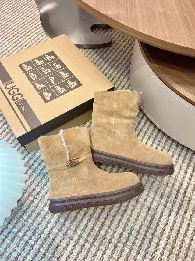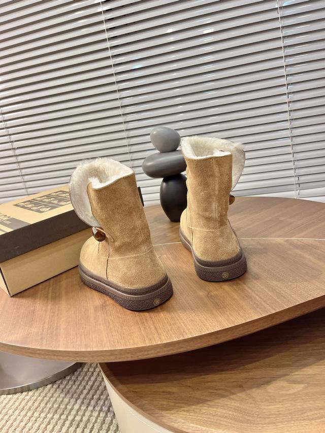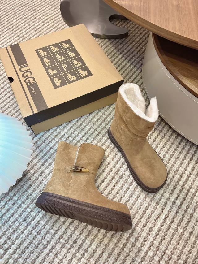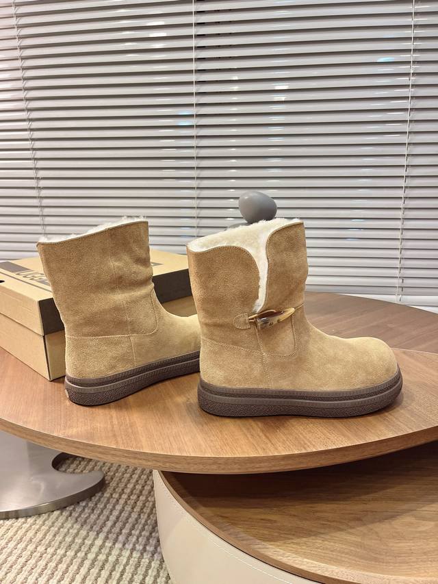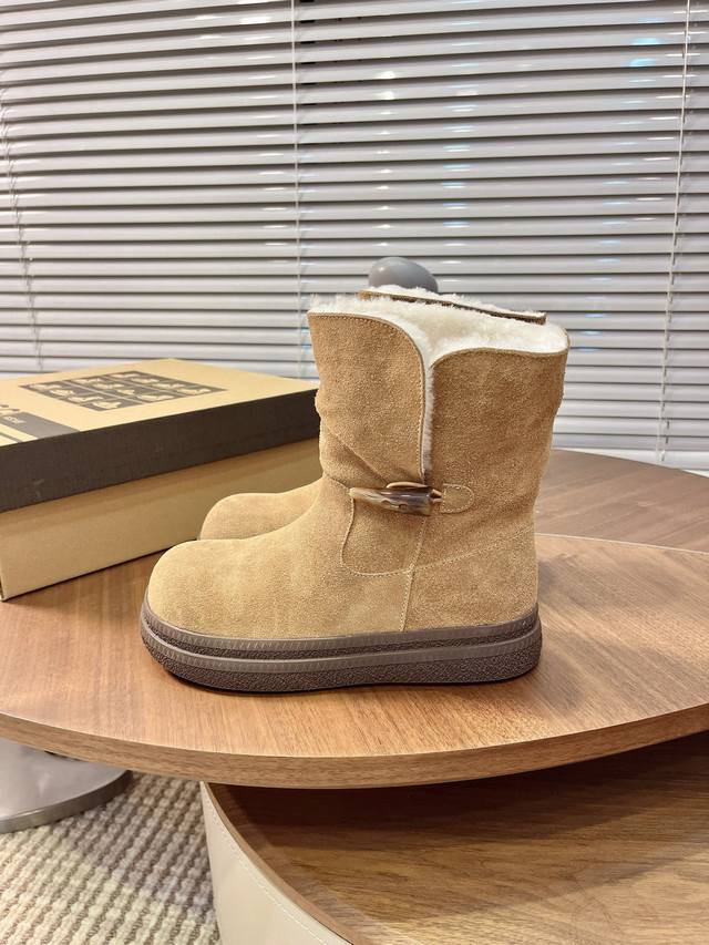 Price: Short Snow Boots Features: Toggle buckle design on the side of the boot shaft for longer legs; Top-grain cowhide upper with sheepskin lining; Non-slip, wear-resistant, plush, and relaxed style; Autumn/Winter color scheme; Trendy elements; Upper: Sheepskin; Sizes: 35-40