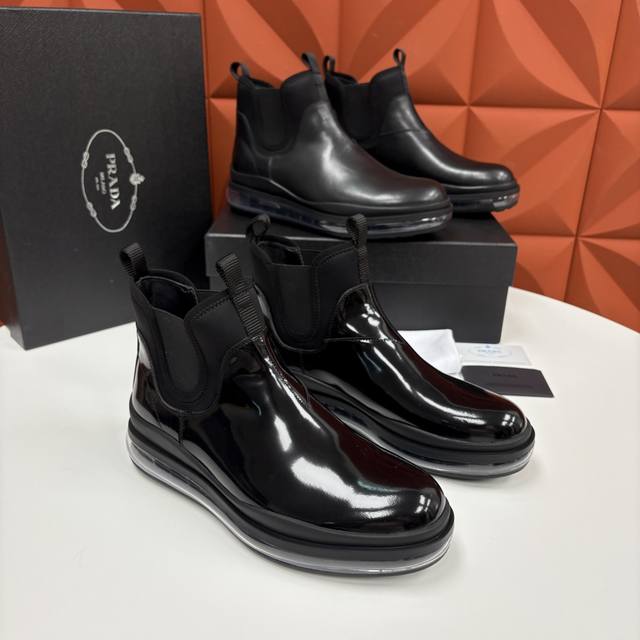 P's New Arrival Prad* Prad Genuine Leather Men's Air-Cushioned Chelsea Boots: A pioneering fusion of luxury and technology. Made from imported matte cowhide with split-edge glossy leather, crafted from high-elasticity and durable custom fabric, the boot shaft features elastic Lycra panels and Chelsea's signature elastic webbing, conforming to the ankle curve for both comfortable support and a sleek design. Easy to slip on and off and suitable for various leg shapes, retaining the classic boot silhouette, creating a harmonious blend of retro and avant-garde styles. Geometric cut, German-imported machine-style precision stitching, distinct diamond pattern, novel and unique design. Full cowhide lining, soft and skin - friendly texture, delicate feel. 2cm latex midsole for added comfort. Exquisite workmanship, original factory ultra-flexible 3.5cm thick sole with air cushion. Silver Prada logo decoration on the heel. Rubber bottom layer for superior comfort and excellent anti-slip performance. A revolutionary design incorporating a full-length transparent air cushion into the Chelsea boot structure; the transparent material contrasts sharply with the black leather, exuding a futuristic feel. Simultaneously, the air cushion technology provides a "walking on clouds" cushioning experience, completely ending the stereotype that "retro shoes = stiff and chafing." Comes with original packaging! DDD Standard leather shoes, sizes: 38-44# Wholesale price: