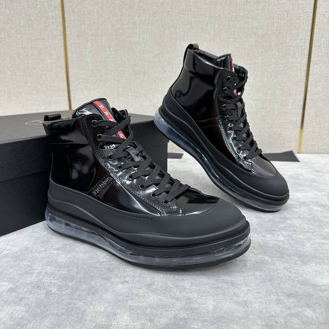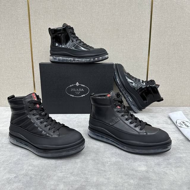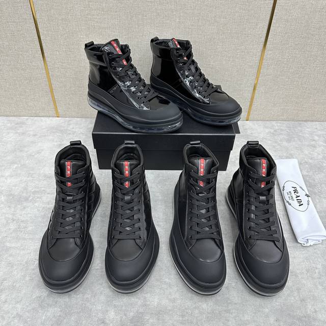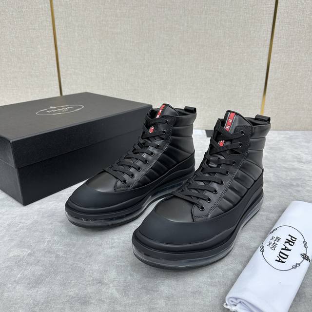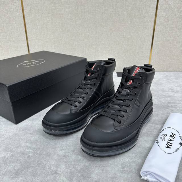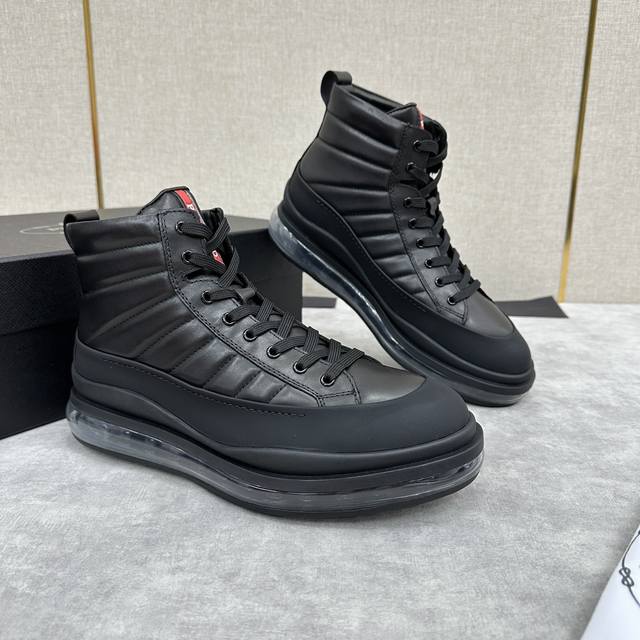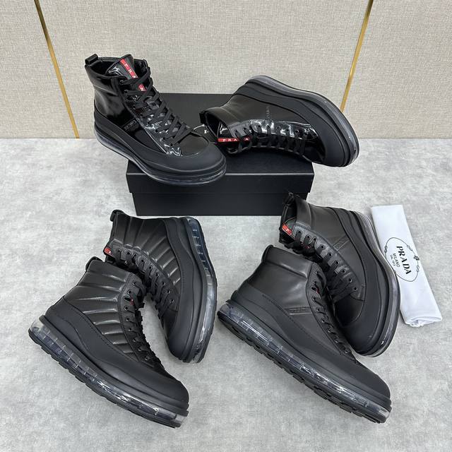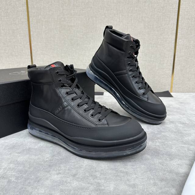 P's new Prad* high-top leather boots for men, made with imported Napa cowhide, featuring a high-top lace-up design, a classic red Prad* logo on the tongue, and a distinctive geometric cut. The German-made leather lining is soft and skin-friendly, with a delicate texture. An additional 2cm latex insole enhances comfort. The original factory-made, ultra-flexible 3.5cm thick sole with a silver Prad logo on the heel and a rubberized bottom provides superior comfort and slip resistance, making them suitable for various occasions. The meticulous craftsmanship and sharp lines create a perfect finishing touch for autumn and winter outfits. Original packaging available! Standard leather shoe sizes: 39-44# Wholesale price: