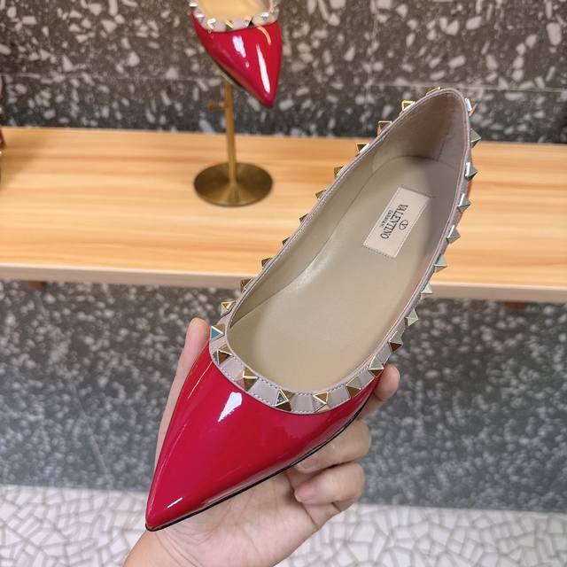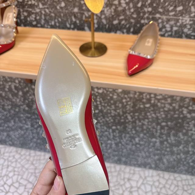 Retail-grade Va*Le*Tino Hua*Tian*Classic Studded Patent Leather Pointed Toe Sandals, Top-tier replica, original from authorized retailers. Welcome to compare. Authentic products available, absolutely the highest quality, far superior to market goods. 1. Original mold, exclusive color matching, original CNC roller stitching, perfect lines and needle holes. 2. Lining uses the same mixed sheepskin as the authentic product, a single piece without splicing, rejecting the spliced linings found in the market. 3. New color scheme, imported Italian genuine leather sole with logo lettering, perfectly shaped. 4. Sizes 35-39, custom sizes 34, 40, 41, 42 available. Original packaging included.
