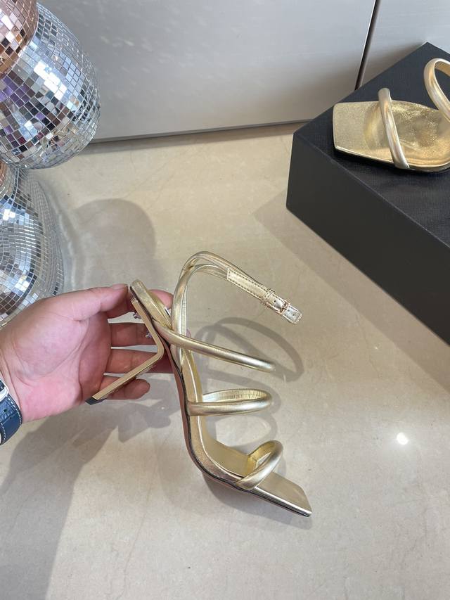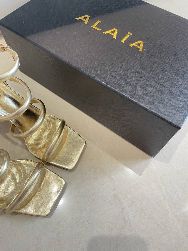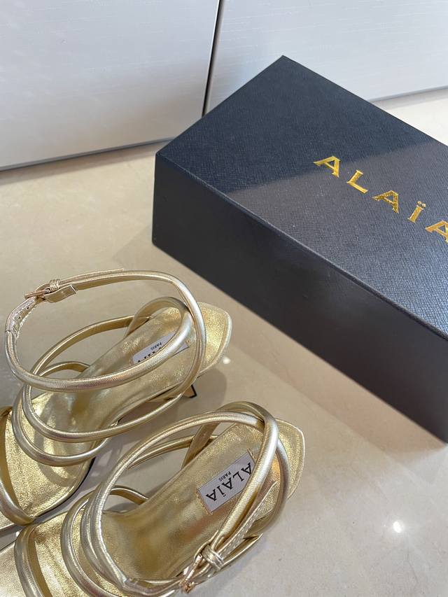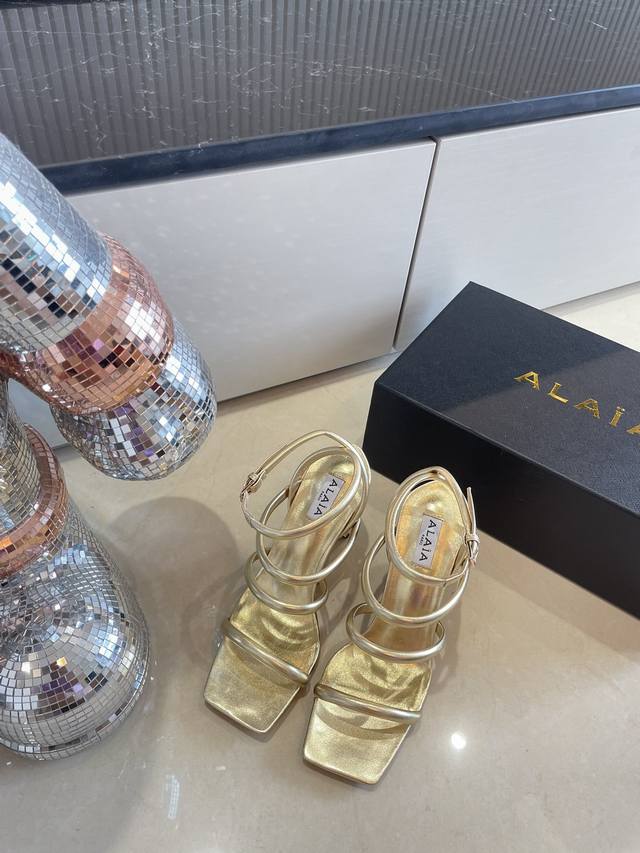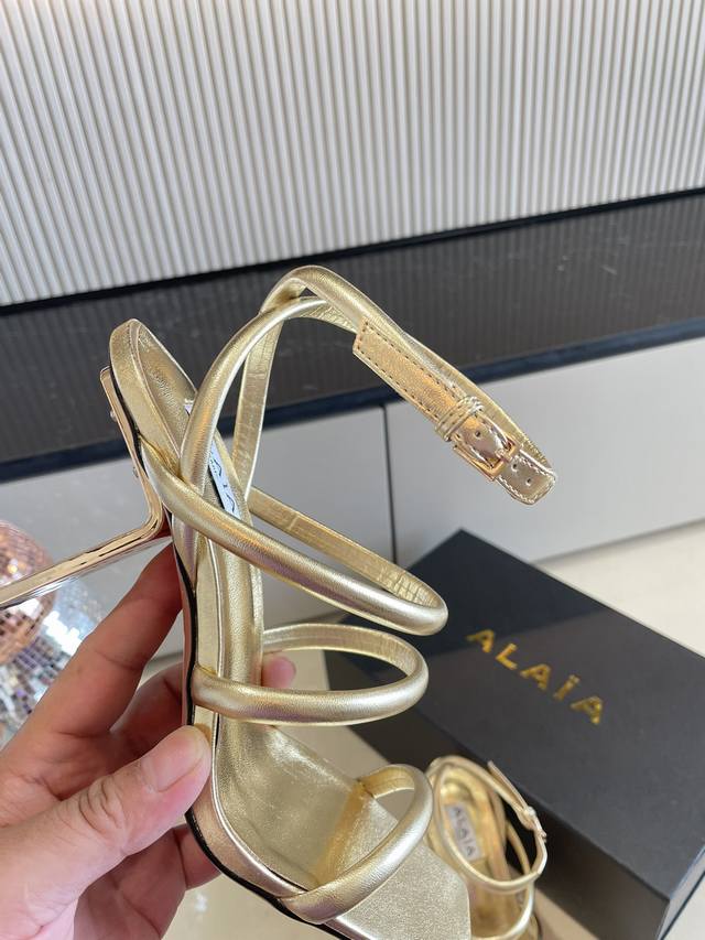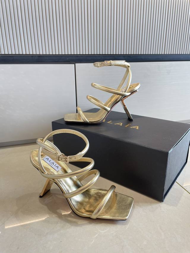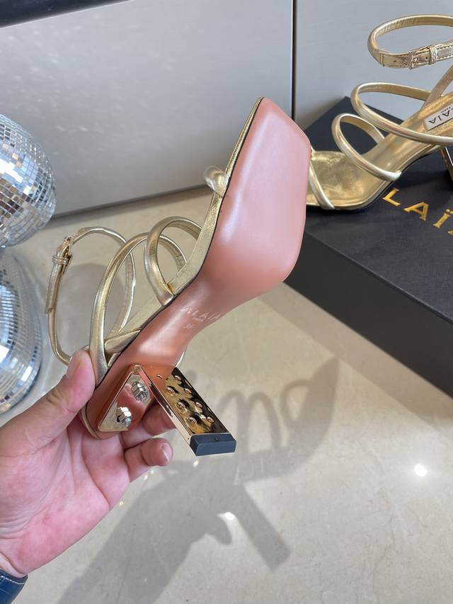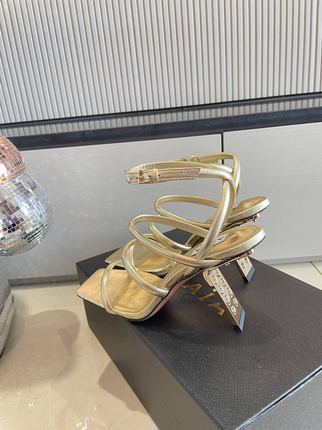 Roman Sandals with Piano Lacquer Geometric Heel, Alaia Strappy Slip-on Sandals from Paris - Love at First Sight! Golden calfskin patent leather, stainless steel geometric heel. Alaia also has another sexy side! Easily paired with different styles and looks, whether it's jeans, suit pants, or a pleated skirt, it elevates your outfit to fashion, elegance, and sophistication. Made with calfskin patent leather with sexy transparent film. Sheepskin lining. Genuine leather outsole, identical to the original. Sizes 34, 35, 36, 37, 38, 39, 40, 41. Custom sizes available. Comes with original packaging.