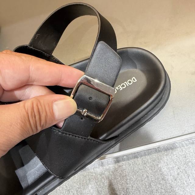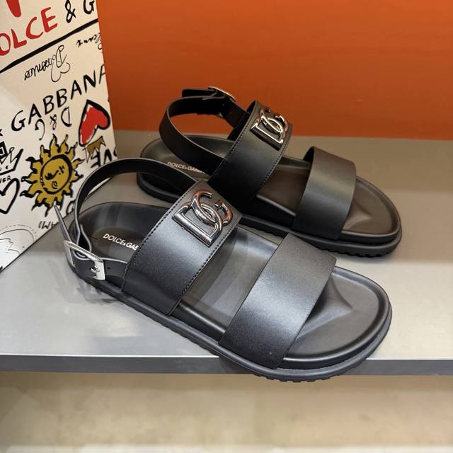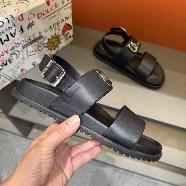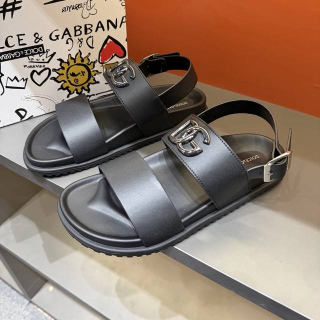 Sizes 38-46 Dg Men's Sandals/Slippers. Showcasing a haute couture design. Dg straps accented with aluminum Dg buckles enhance the style. Paired with a comfortable, toned-toe notched sole, easily paired with shorts or jeans for a sophisticated look. Body: Cow leather, technical fabric. Lining: Cow leather, with adjustable straps and aluminum Dg buckles. Eva insole. Toned-toe notched rubber outsole with a patchwork construction.