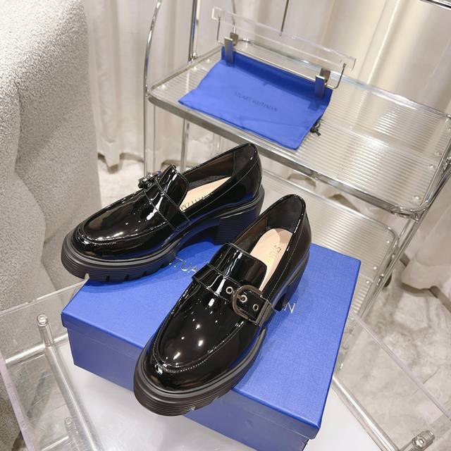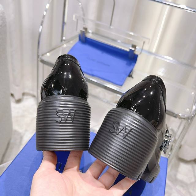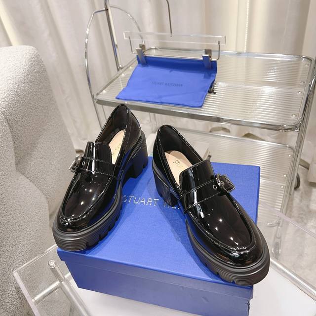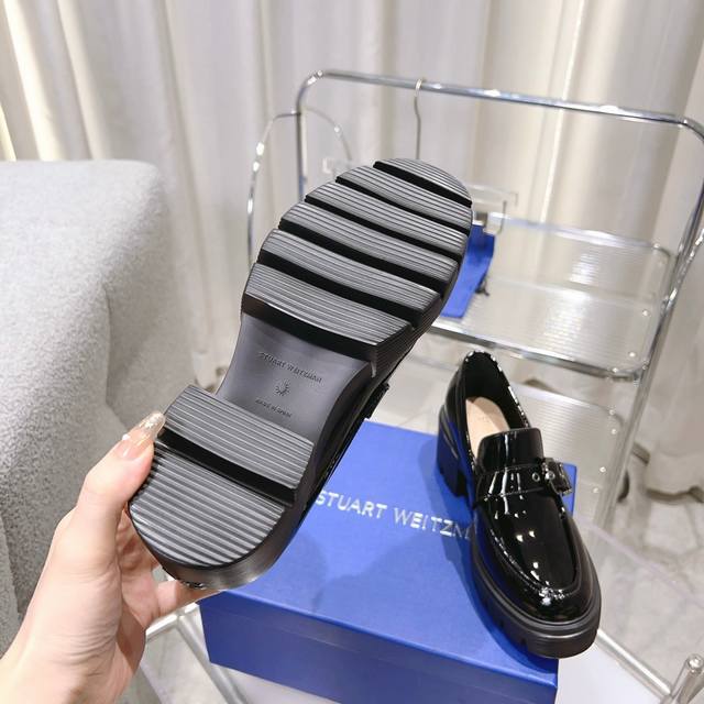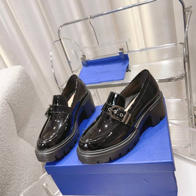 Sw 2025 Early Spring New Platform Loafers. Classic luxurious patent leather craftsmanship injects a fashionable and avant-garde free-spirited personality into everyday flat shoes, making the shoes both practical and trendy. The simple and smooth lines, paired with a slightly narrowed almond-shaped round toe, particularly flatter the foot shape, making the feet appear delicate and slender without squeezing the toes. The lightweight rubber sole provides overall practicality and elasticity, requiring no break-in period and adapting well. They are comfortable to walk in, adding height and slimming the figure, and are versatile. Materials: Mirror-finish soft patent leather, EVA foam molded outsole, ultra-lightweight, 6cm heel. Sizes: 34-40.