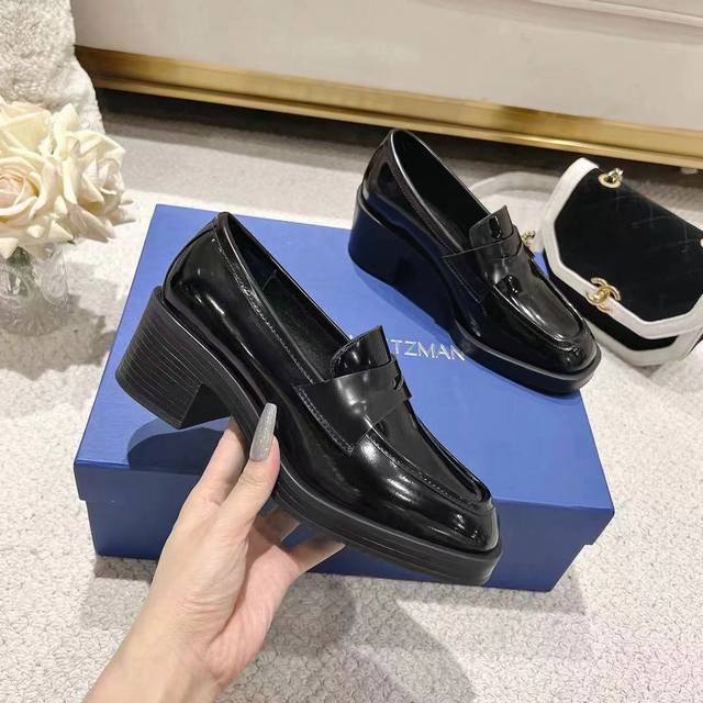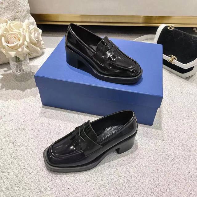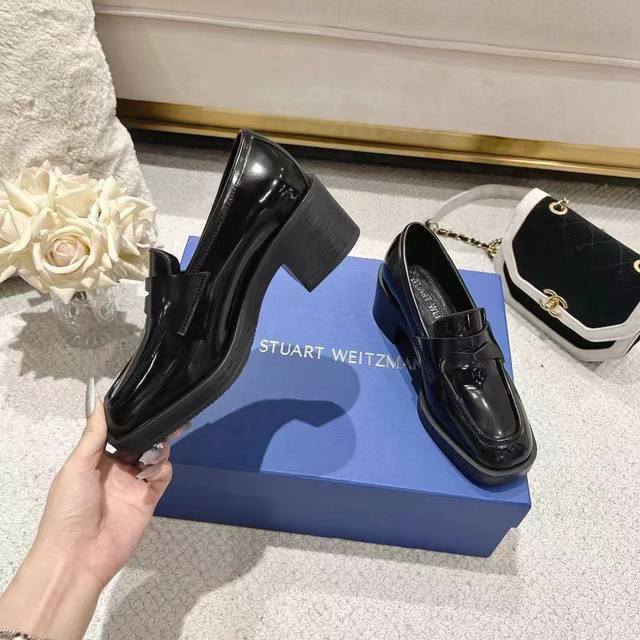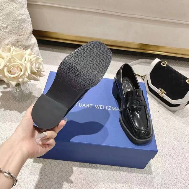 Sw Early Spring New Platform Loafers. Classic luxurious patent leather craftsmanship injects a fashionable and avant-garde free-spirited personality into everyday flat shoes, making the shoes both practical and trendy. The simple and smooth lines paired with a slightly narrowed almond round toe flatter the foot shape, making the feet appear delicate and slender without squeezing the toes. The lightweight rubber sole provides overall practicality and elasticity, requiring no break-in period and adapting well. They are comfortable to walk in, adding height and slimming the figure, and are versatile. Material: Split edge bead, 5cm heel. Sizes 34-40.