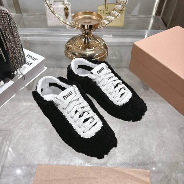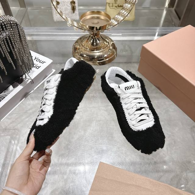 These are Miumi's latest season casual wool sneakers, perfect for this fall and winter. The simple panel design and distinctive tongue give them a super youthful and sunny look. Warm and cute with a fluffy texture, they're versatile and easy to match with any casual style. Sizes 34-40.