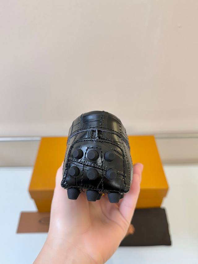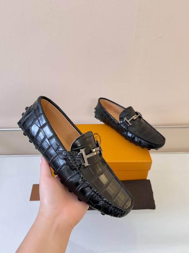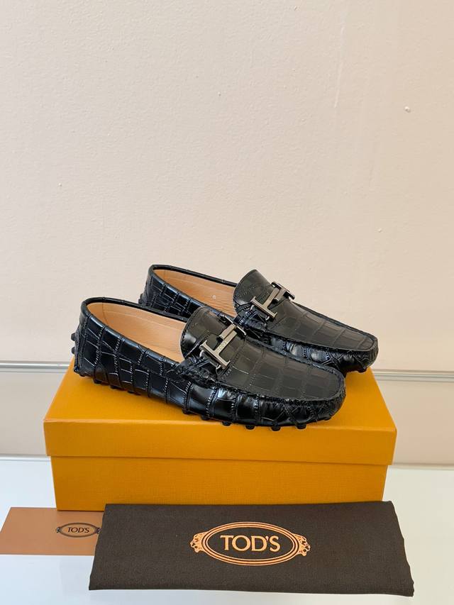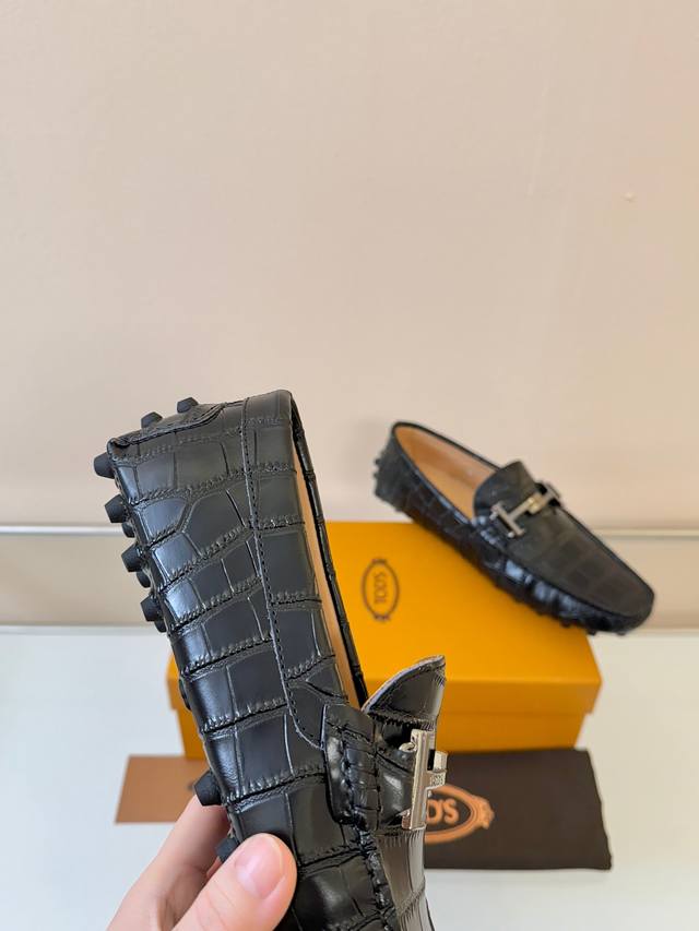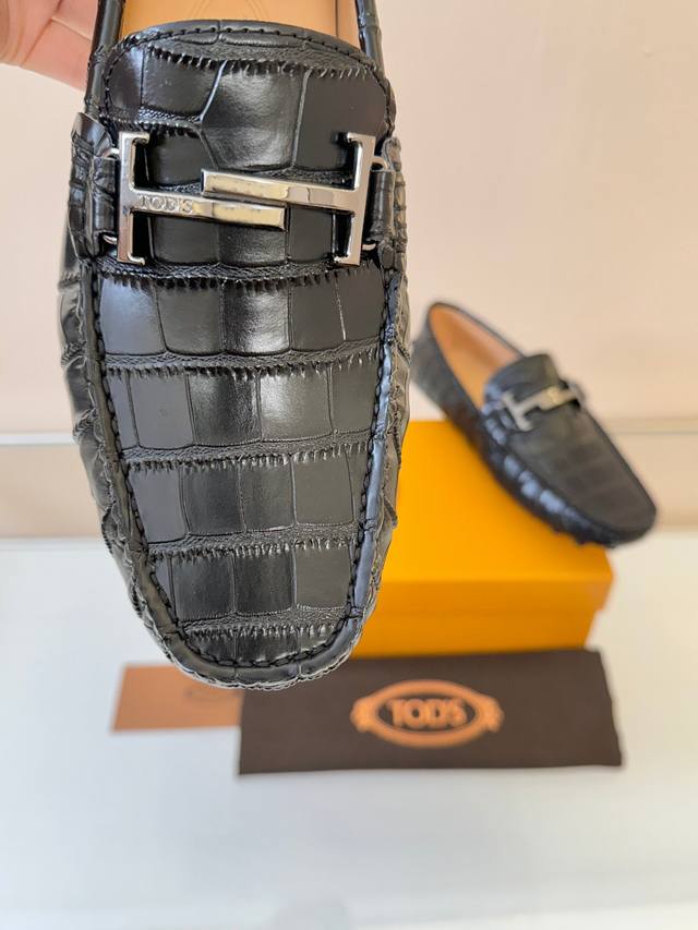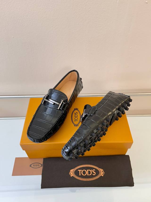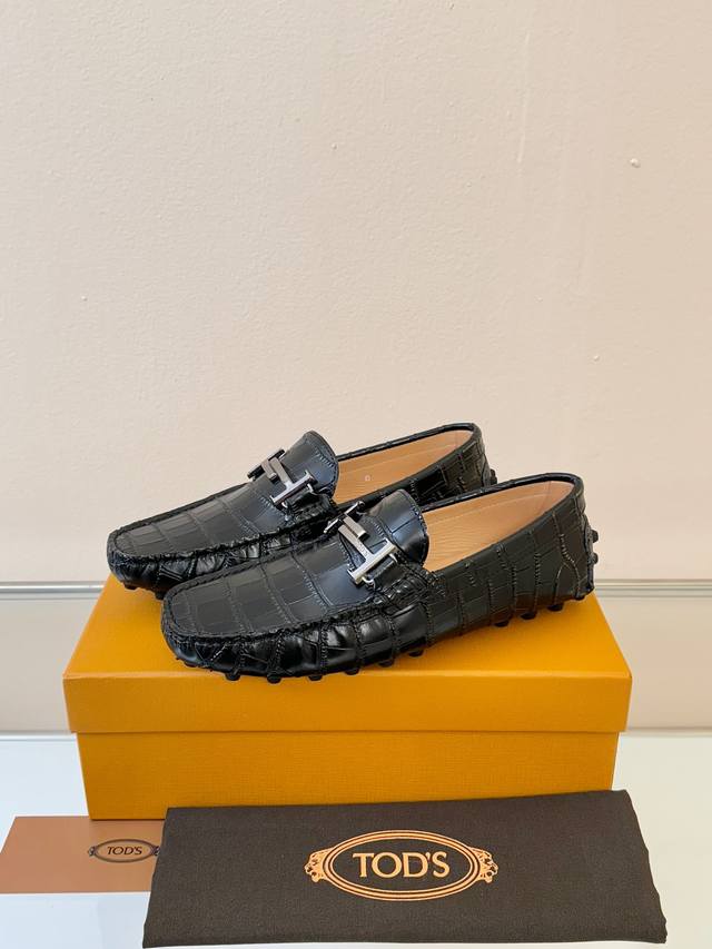 Tods Men's Loafers, New Arrival, High-Quality Crocodile-Patterned Leather, Apricot Lining. Original Packaging. Black. Sizes 38-45. (DDD)