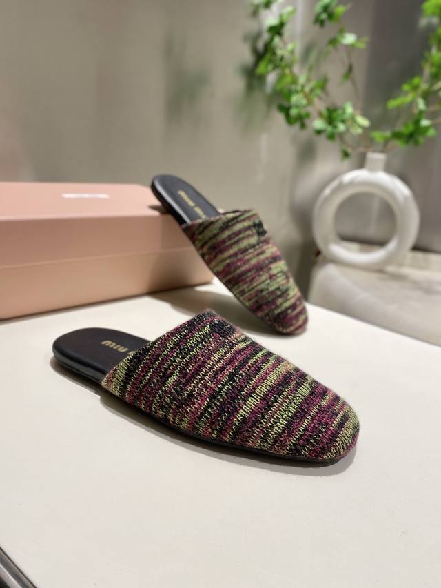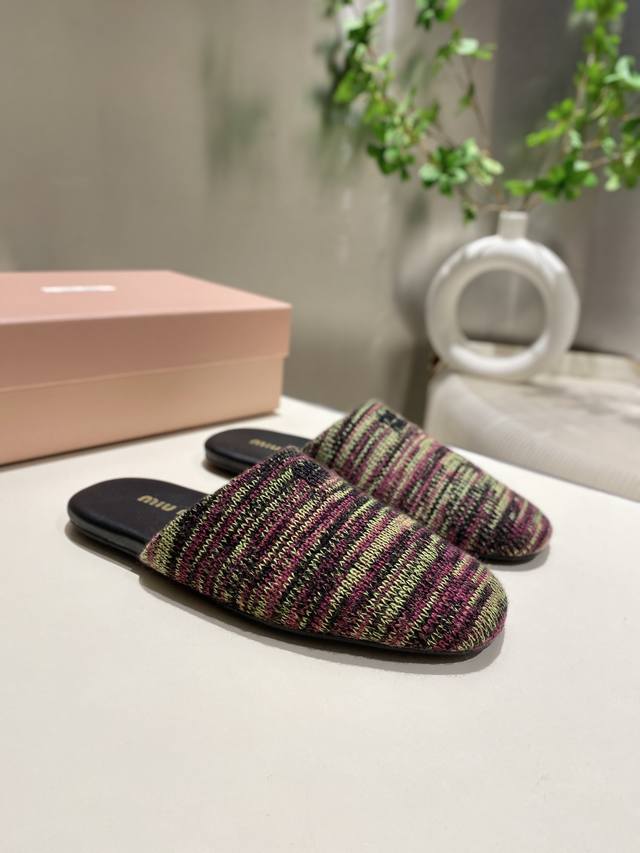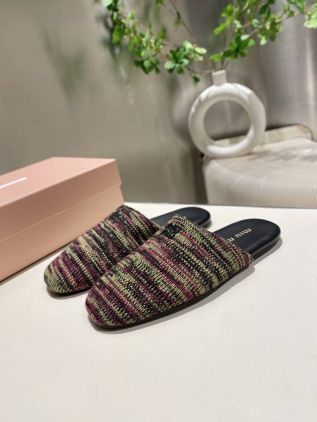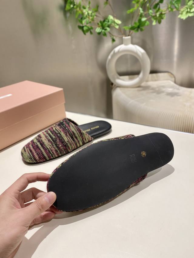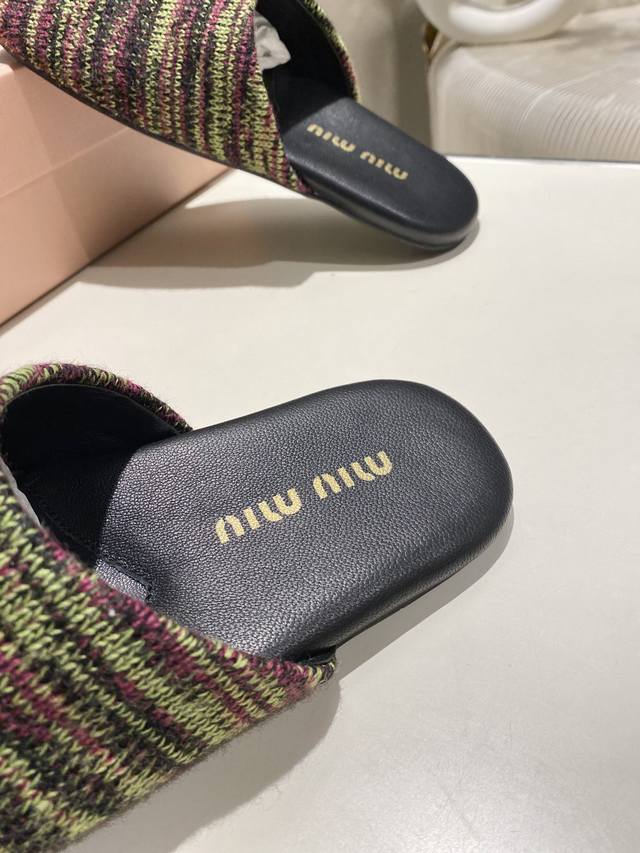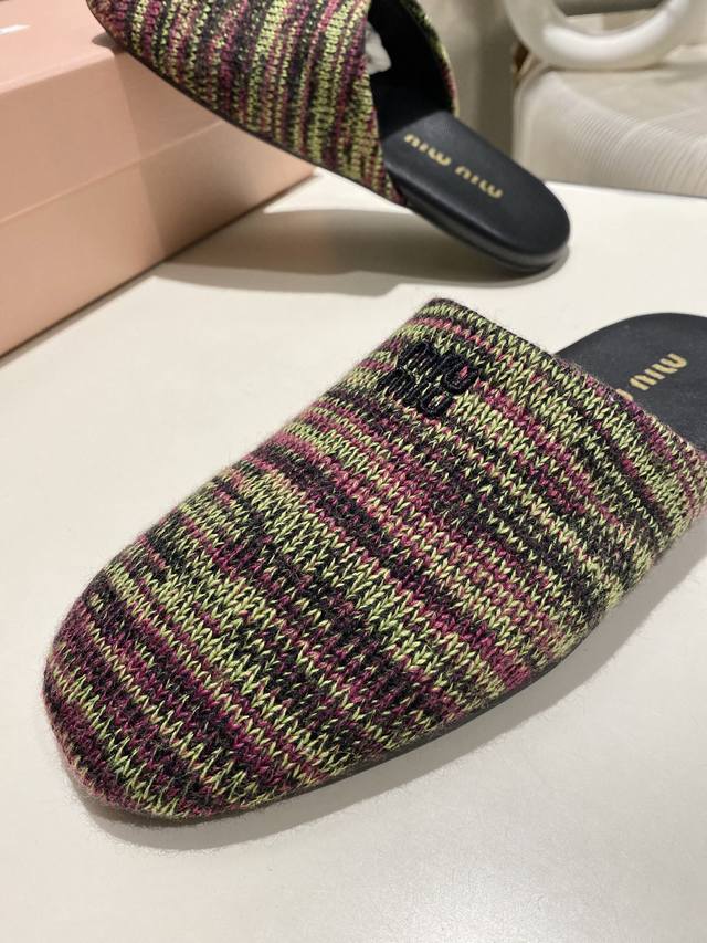 Top-tier factory-made, high-quality Miu Miu 2025 early spring new wool knitted closed-toe slippers. Recommended by numerous bloggers, a must-buy, you won't regret it. Looks great with any outfit. 1:1 replica of the original. Upper: Custom imported knit. Sole: Rubber outsole. Lining: Sheepskin. Sizes: 35-41. Sizes 40 and 41 are custom-made and non-refundable.