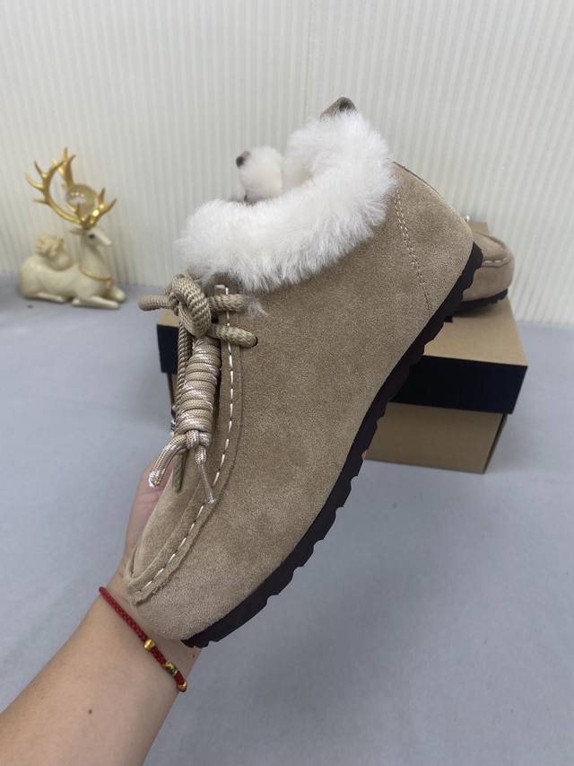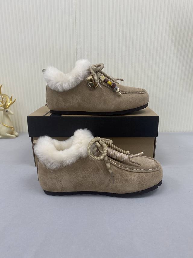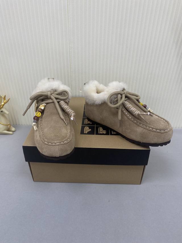 Ugg Unlabeled Autumn/Winter Wool Snow Boots! The upper features a contrasting color design, creating a classic and timeless look. Combined with soft and warm sheepskin, it not only enhances the texture but also adds a finishing touch to any autumn/winter outfit. The lining is made of comfortable genuine wool, making them easy to slip on and off! Extremely stylish! Material: Cow Suede; Lining: Wool; Outsole: Rubber; Sizes: 35-40
