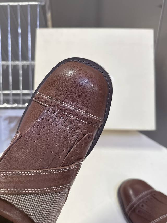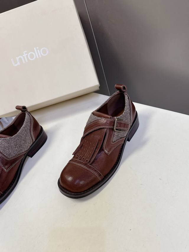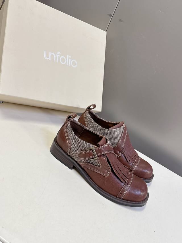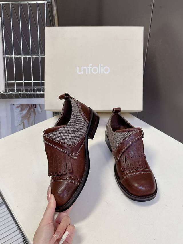 Unfolio, a niche brand, presents their latest Eloise monk strap loafers. Made with carefully selected natural-textured cowhide and warm wool fabric, the exquisite combination perfectly captures a vintage feel. Inheriting the iconic monk strap details such as the single buckle, tassels, and hand-drilled perforations, the essence is further refined in the leather welt trim and genuine leather-wrapped heel. The deep reddish-brown bronze tone exudes a rich vintage vibe, embodying a modern narrative of informal preppy style. Materials: Imported calfskin; Lining: Water-dyed cowhide; Outsole: Original molded anti-slip outsole; Size: 35-40. Size 40 is custom-made, no returns or exchanges.