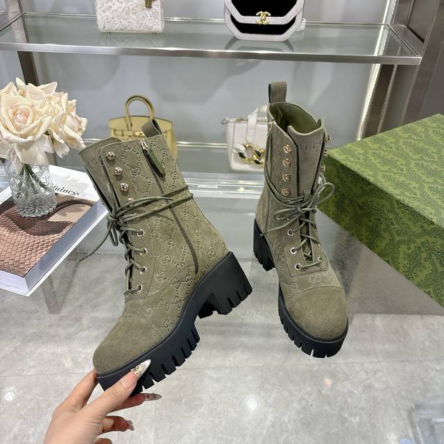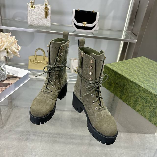 Women's Gg Lace-up Leather Ankle Boots DDD These lace-up ankle boots are crafted from signature Gg calfskin leather, showcasing the brand's timeless and elegant aesthetic. The bold silhouette, paired with a rubber grooved sole, provides stable support while giving the overall style a modern and sophisticated feel. DDD Suede embossed Gg leather DDD Rubber grooved sole DDD Lace-up closure DDD Height: Forefoot heel height: 3.5 cm; Heel height: 6 cm DDD Italian design DDD Sizes: 36-42 DDD
