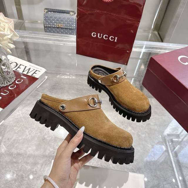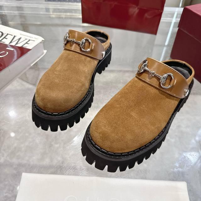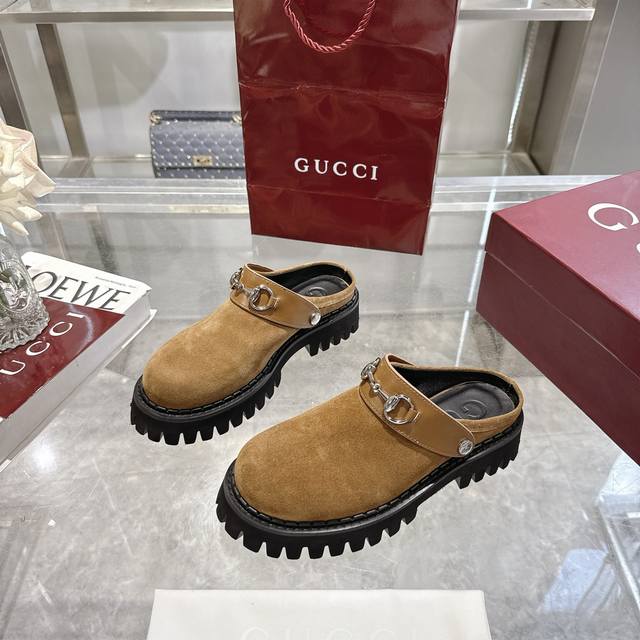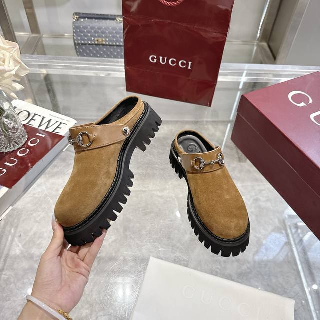 Women's Mule Shoes with Horsebit Buckle Horsebit pays homage to the brand's equestrian history, which has become a symbol of both historical significance and modern sensibility over the years. Here, it defines this women's mule shoe made of suede. Brown suede upper, silver hardware, horsebit buckle, rubber foam sole, low heel, height: .5, Made in Italy, sizes 36-42.