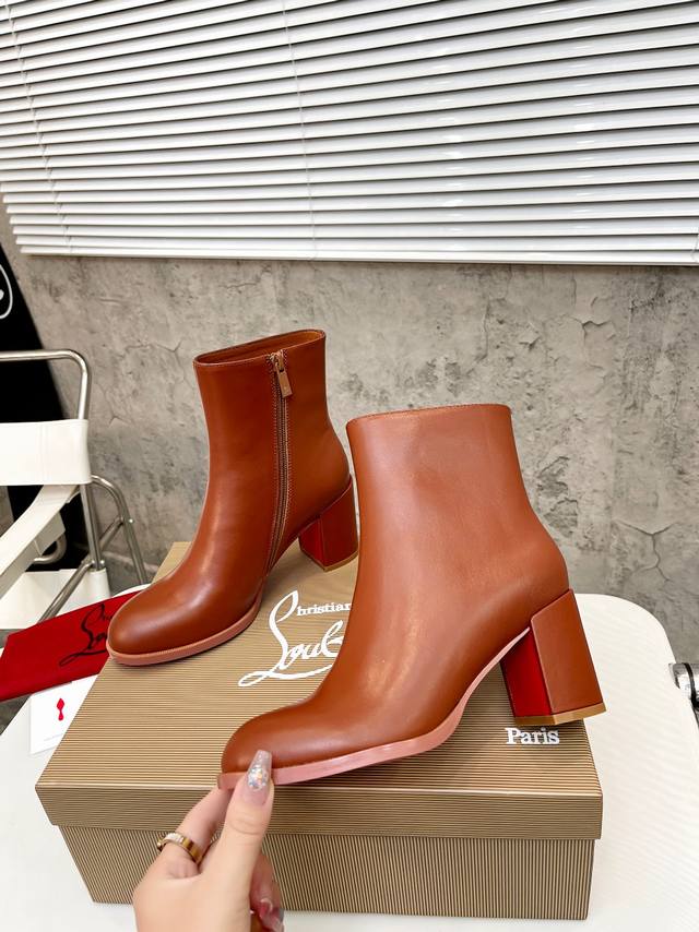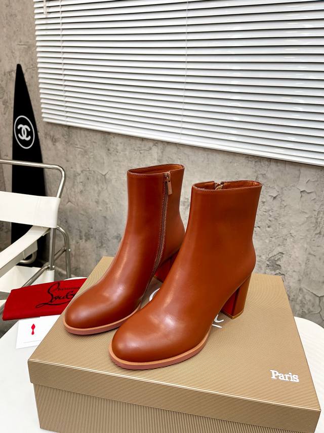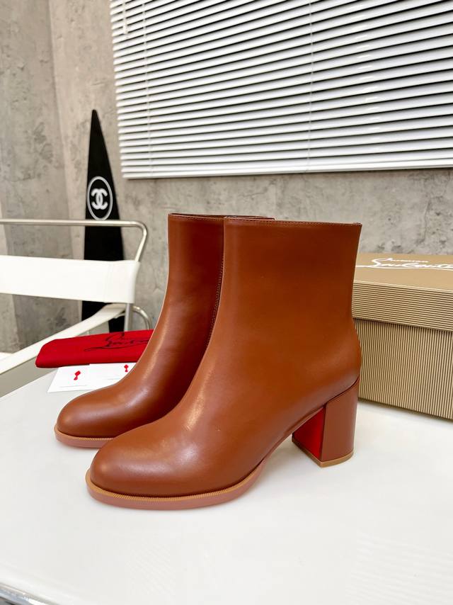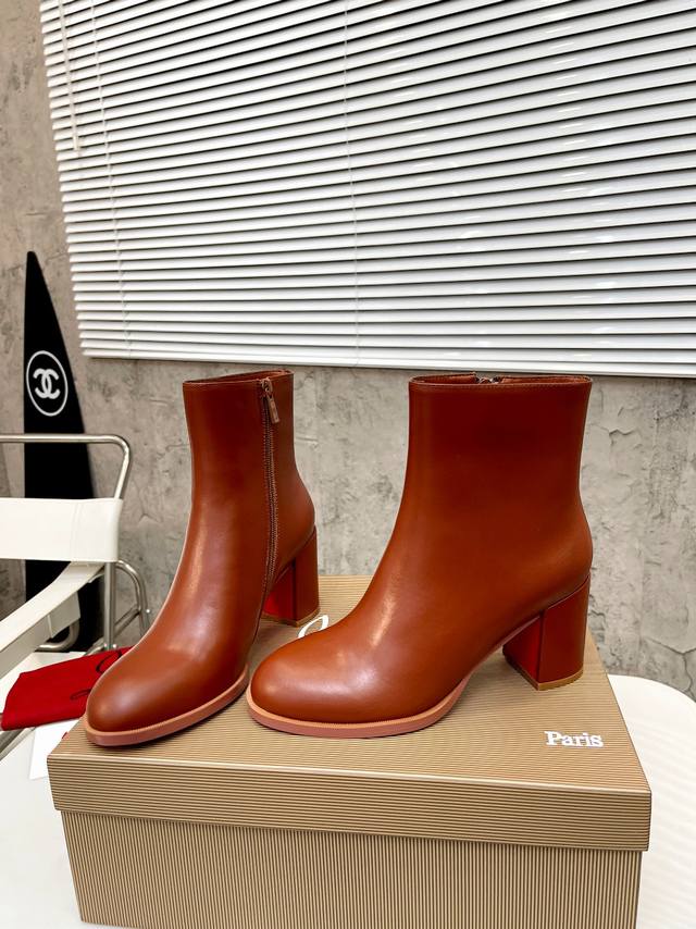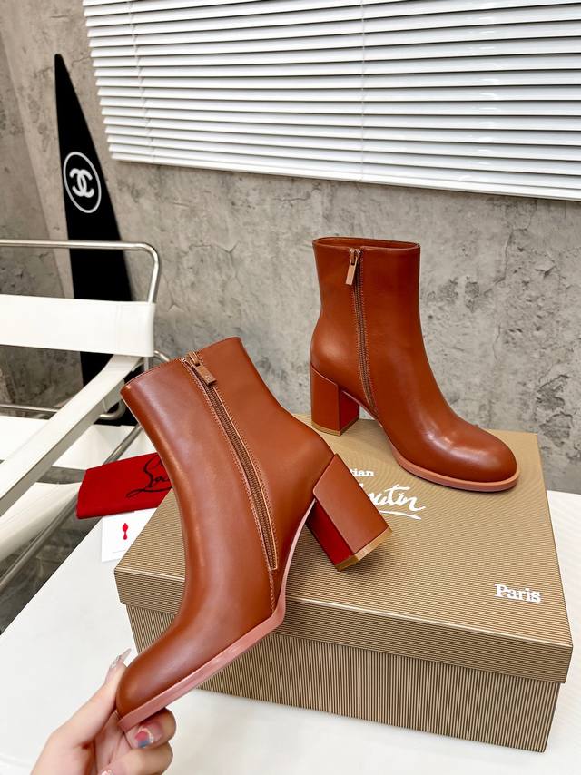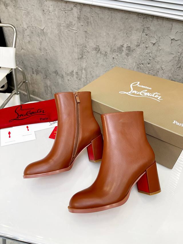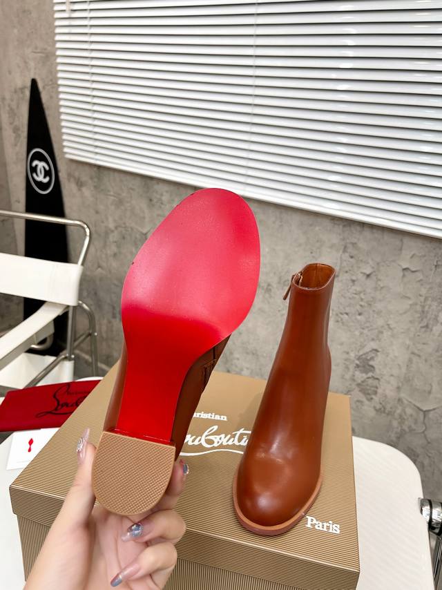 Yuan: Christian Louboutin Cl's new chunky-heeled platform boots, crafted from glossy calfskin, simple and stylish, 4-inch (12cm) shaft height. Material: Grained cowhide; Lining: Sheepskin; Heel height: Rubber, 7cm; Colors: Black, Reddish-brown; Sizes: 34-41 (34, 41 custom sizes); Packaging: Original packaging.