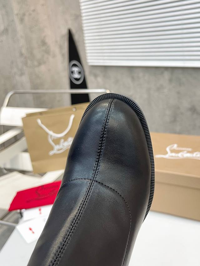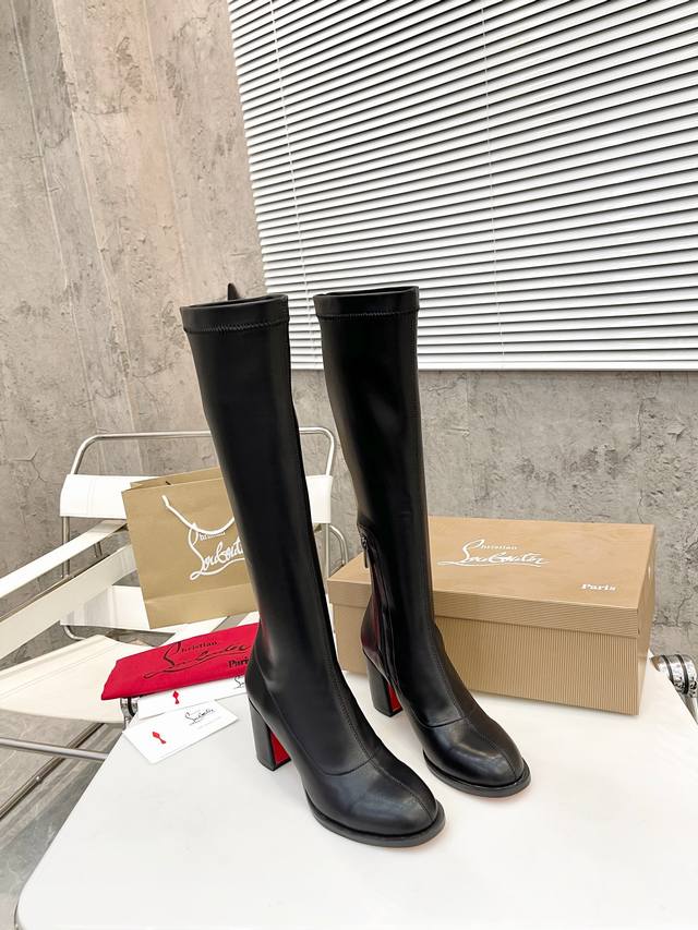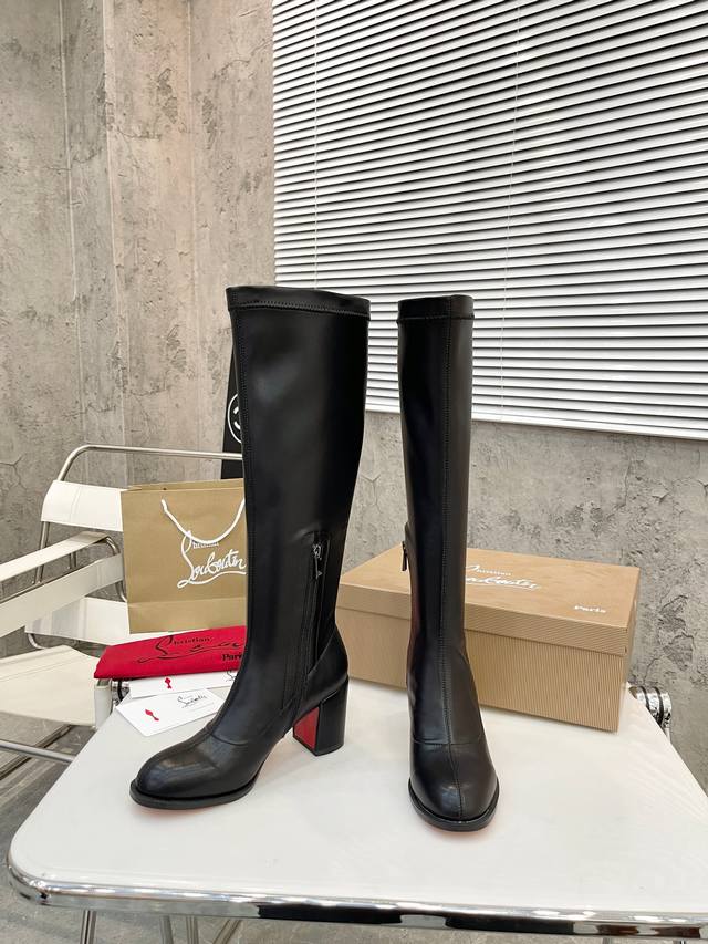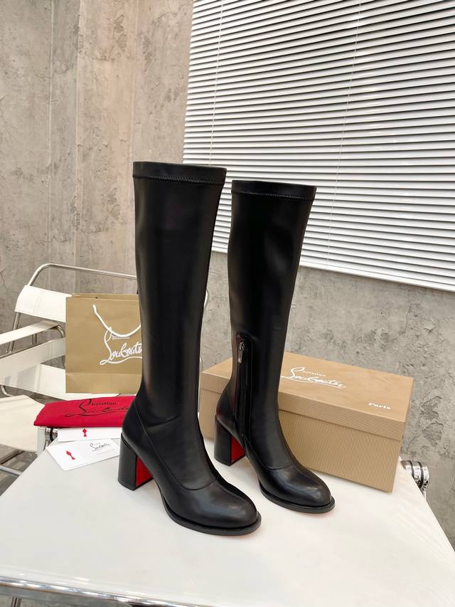 Yuan: Christian Louboutin Cl's new chunky-heeled stretch ankle boots are a classic and sophisticated design with sleek, slender lines. They feature a 70mm square heel. Pull them up to your calf for different occasions; one pair can be worn as two. Shaft height: 16 inches. Material: Stretch velvet leather; Lining: Sheepskin; Heel height: Rubber, 7cm; Color: Black stretch velvet, black stretch leather, khaki stretch suede; Sizes: 34-41 (34, 41 custom sizes available); Packaging: Original packaging.