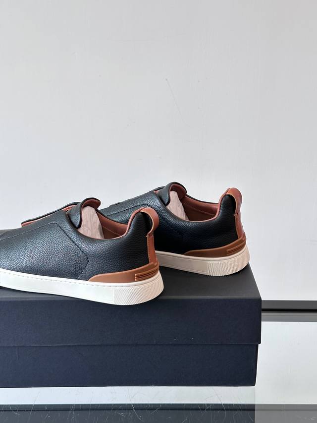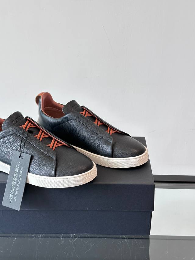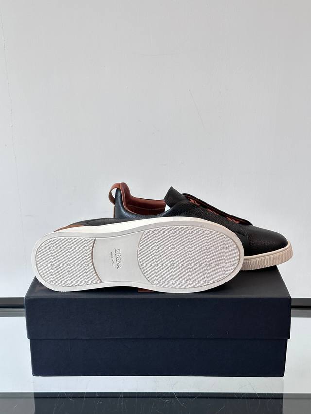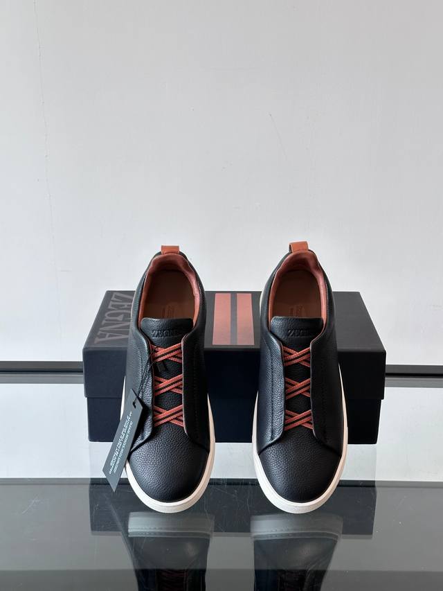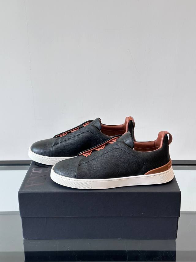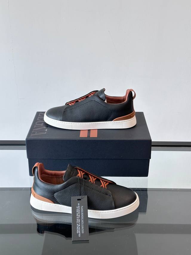 Zegna's new men's low-top leather sneakers, crafted from imported cowhide, feature rich craftsmanship details, including vicu?a leather inlays on the sole and embossed brand logo details. The clean and simple design lines are highly versatile, elegant, and dynamic. The non-slip, wear-resistant, and durable rubber outsole, along with hand-stitched seams between the sole and upper, ensures durability and prevents the sole from falling off. A very good trendy casual sneaker item for men! Size: 38-45