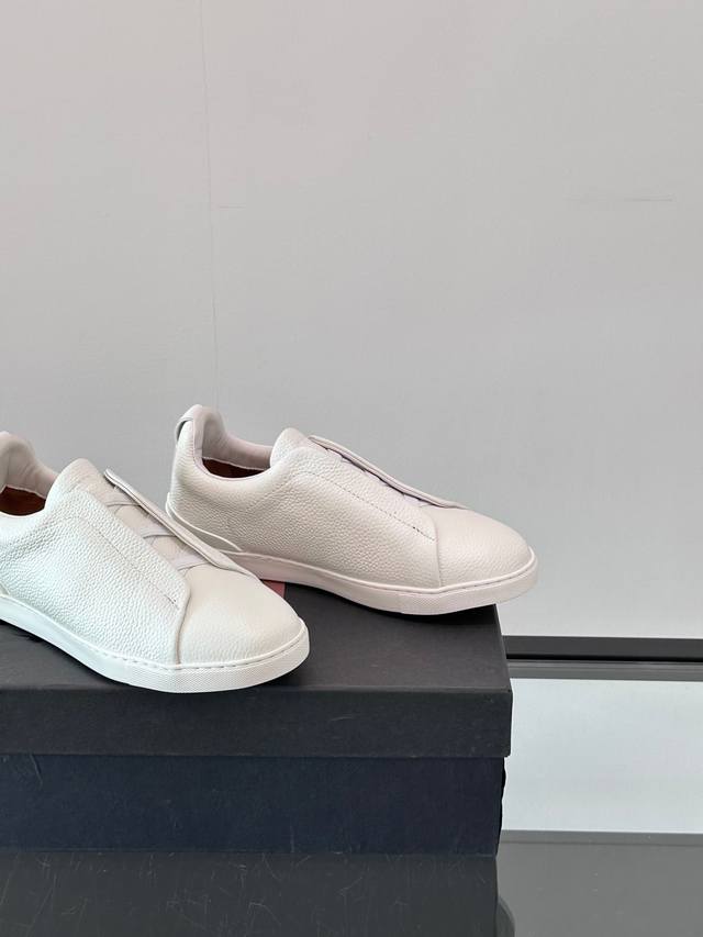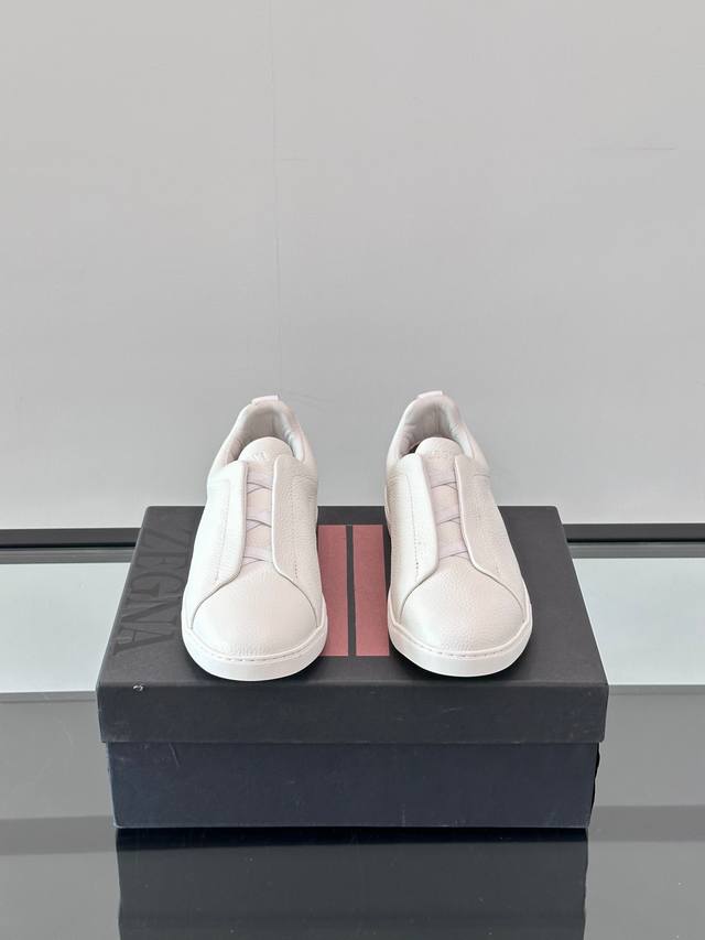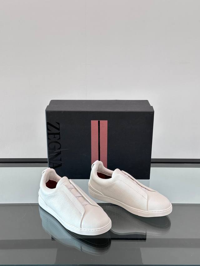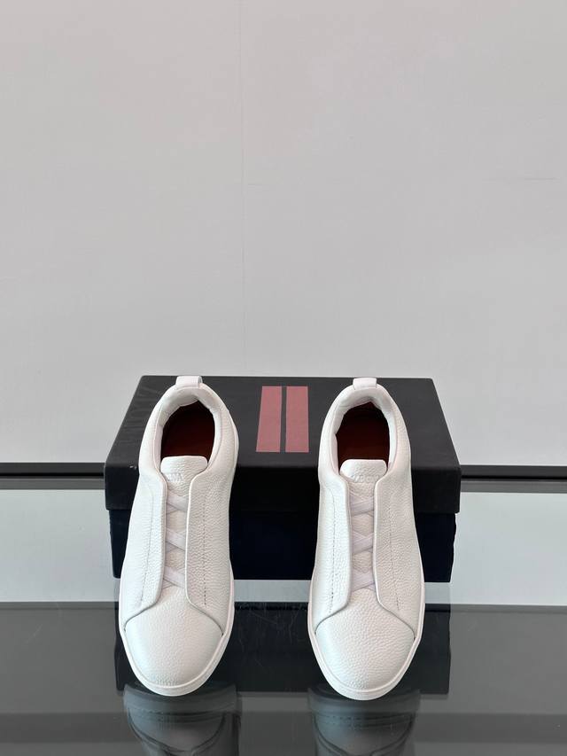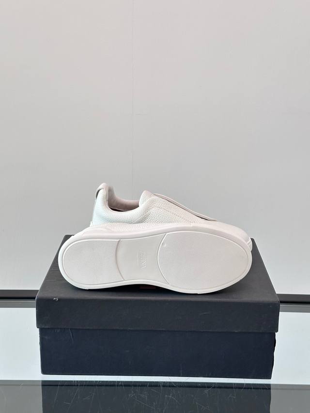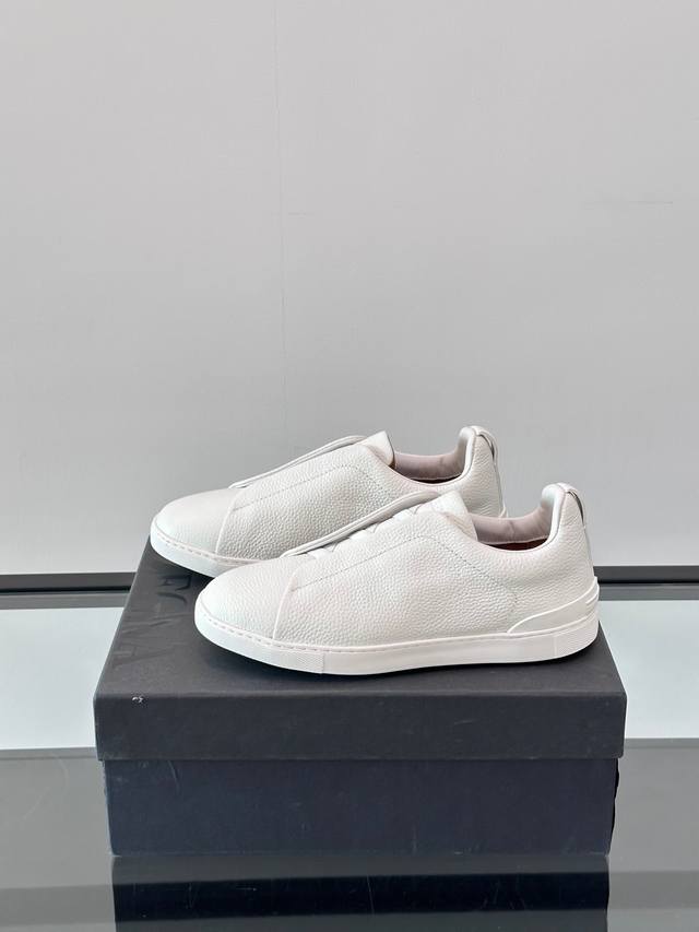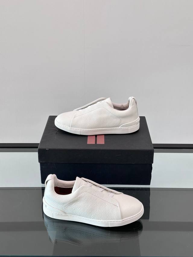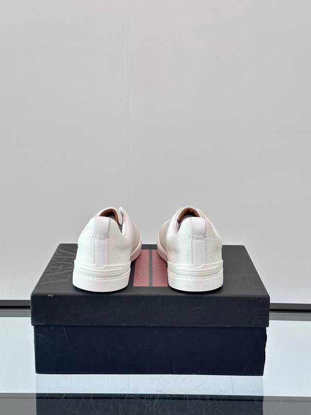 Zegna's new men's low-top leather sneakers, crafted from imported cowhide, feature rich craftsmanship details, including vicu?a leather inlays on the sole and embossed brand logo details. The clean and simple design lines are highly versatile, elegant, and dynamic. The non-slip, wear-resistant, and durable rubber outsole, along with hand-stitched seams between the sole and upper, ensures durability and prevents the sole from falling off. A very good trendy casual sneaker item for men! Size: 38-45