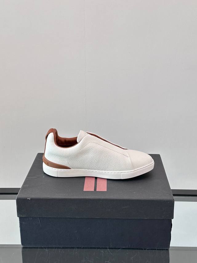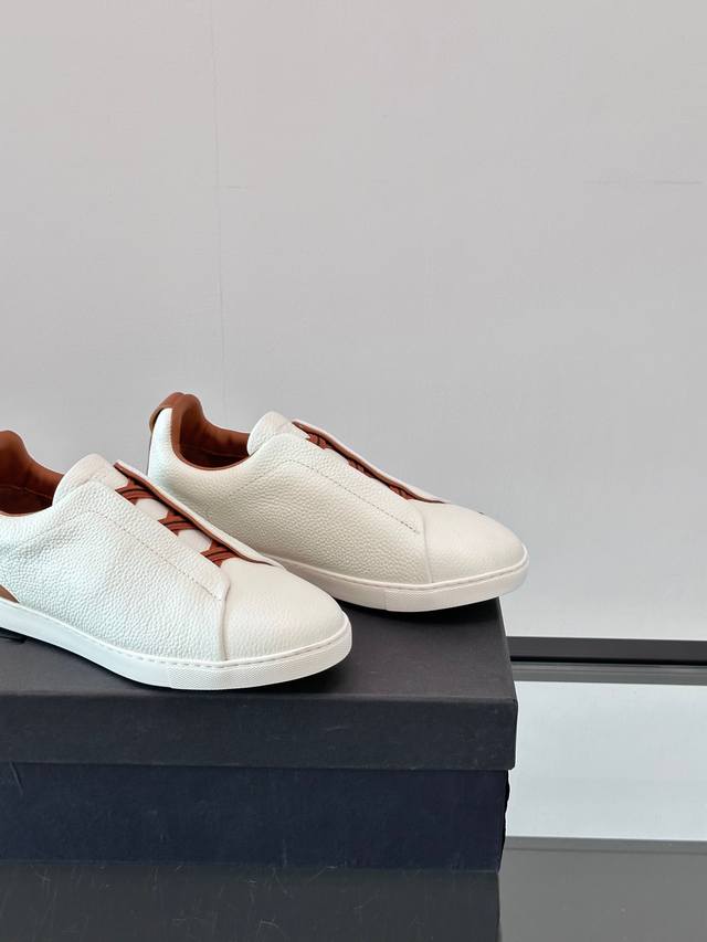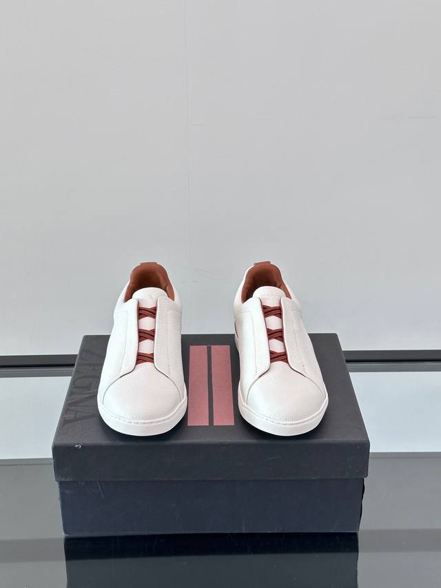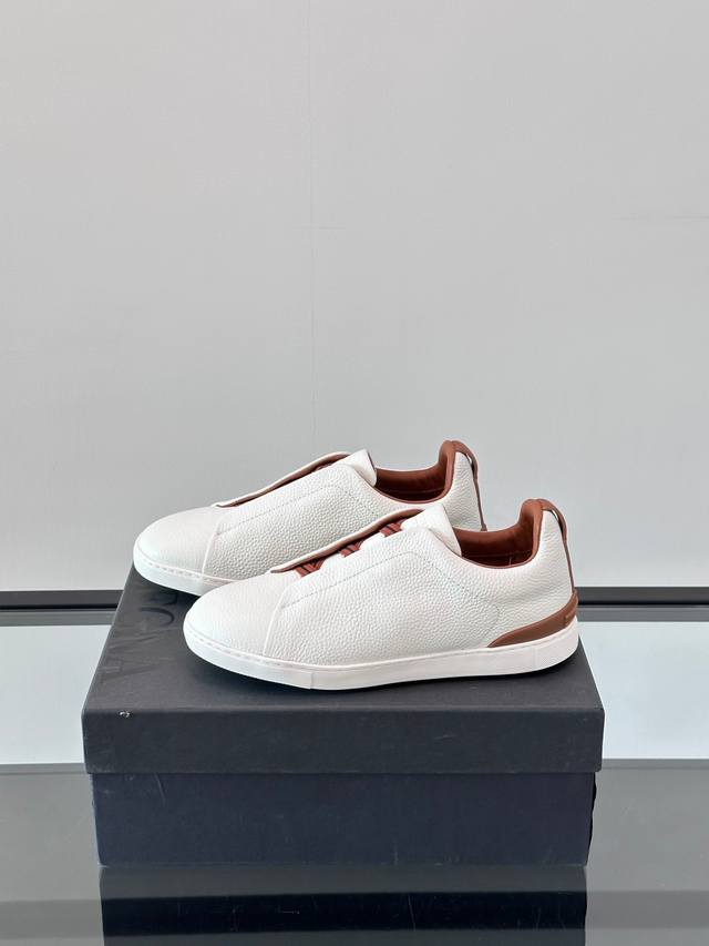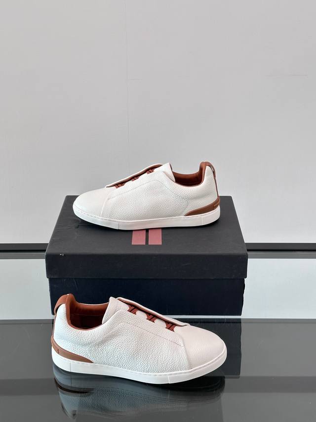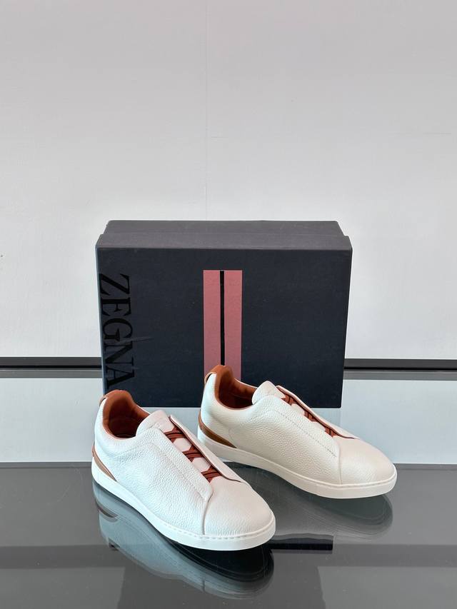 Zegna's new men's low-top leather sneakers, crafted from imported cowhide, feature rich craftsmanship details, including vicu?a leather inlays on the sole and embossed brand logo details. The clean and simple design lines are highly versatile, elegant, and dynamic. The non-slip, wear-resistant, and durable rubber outsole, along with hand-stitched seams between the sole and upper, ensures durability and prevents the sole from falling off. A very good trendy casual sneaker item for men! Size: 38-45
