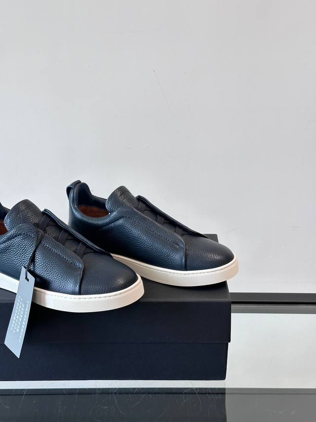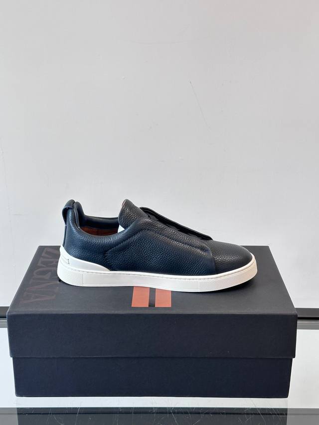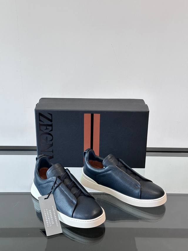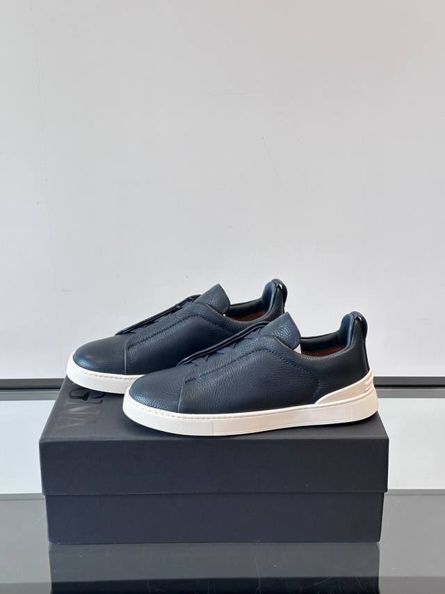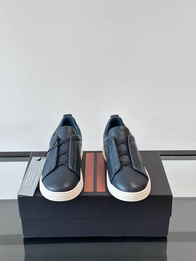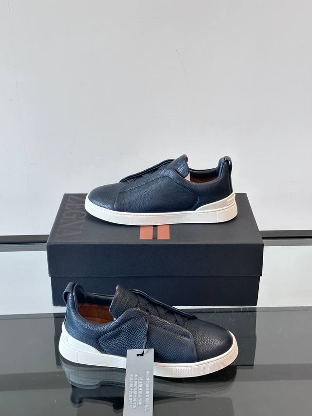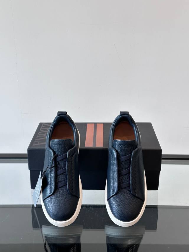 Zegna's new men's low-top leather sneakers, crafted from imported cowhide, feature rich craftsmanship details, including vicu?a leather inlays on the sole and embossed brand logo details. The clean and simple design lines are highly versatile, elegant, and dynamic. The non-slip, wear-resistant, and durable rubber outsole, along with hand-stitched seams between the sole and upper, ensures durability and prevents the sole from falling off. A very good trendy casual sneaker item for men! Size: 38-45